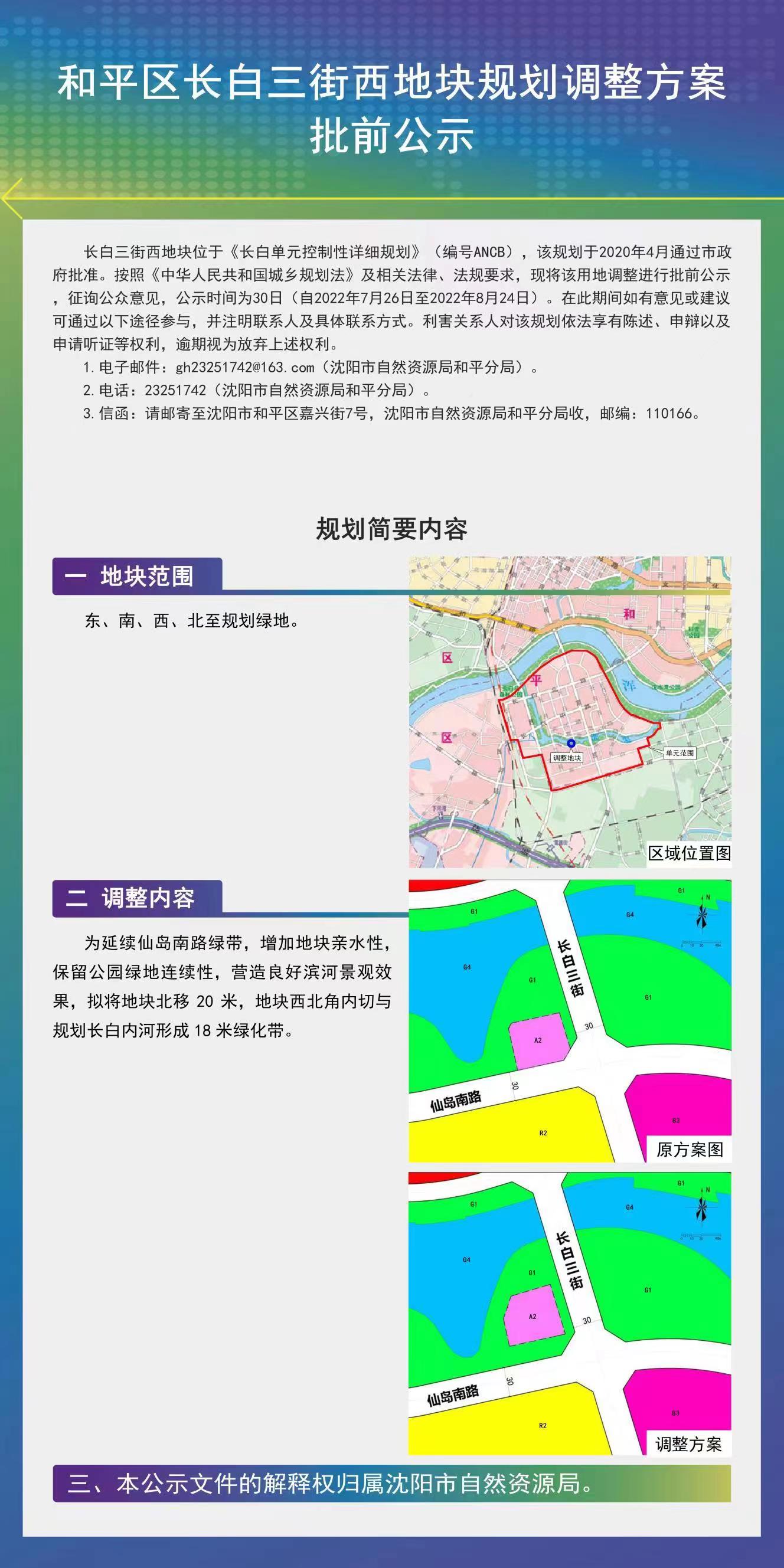 和平区长白三街西地块规划调整方案批前公示 长白三街西地块位于《长白单元控制性详细规划》(编号ANCB),该规划于2020年4月通过市政府批准。按照《中华人民共和国城乡规划法》及相关法律、法规要求,现将该用地调整进行批前公示,征询公众意见,公示时间为30日(自2022年7月26日至2022年8月24日)。在此期间如有意见或建议可通过以下途径参与,并注明联系人及具体联系方式。利害关系人对该规划依法享有陈述、申辩以及申请听证等权利,逾期视为放弃上述权利。 1.电子邮件:gh23251742@163.com(沈阳市自然资源局和平分局)。 2.电话:23251742(沈阳市自然资源局和平分局)。 3.信函:请邮寄至沈阳市和平区嘉兴街7号,沈阳市自然资源局和平分局收,邮编:110166。