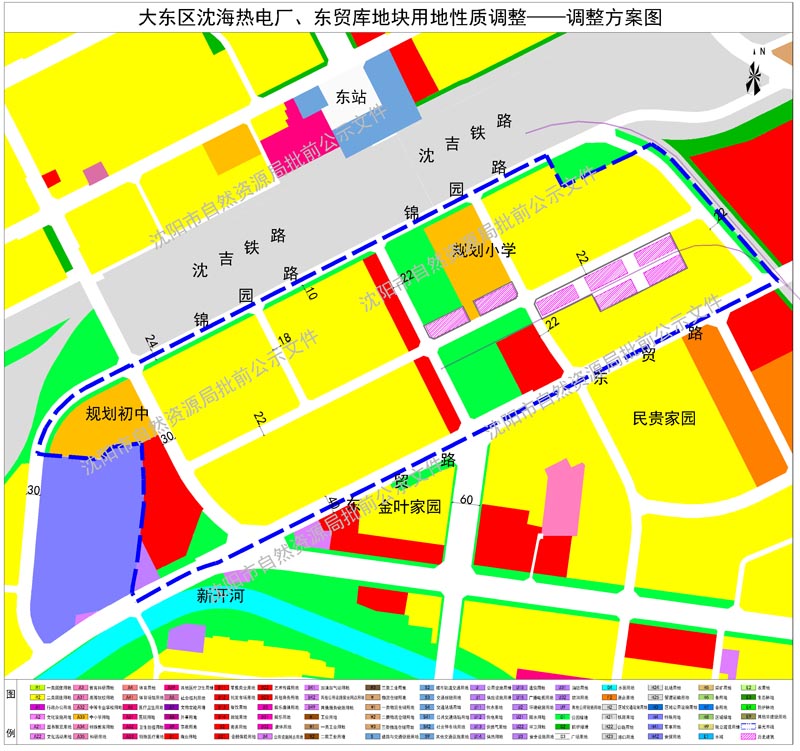 规划简要内容 一、单元范围: 东至高官台街,南至东陵路,西至北海街、北至沈吉铁路,单元面积约5.7平方公里。 二、地块范围: 东至铁路专用线,南至东贸路,西至用地界线、北至锦园路,地块面积约67公顷。 三、调整背景: 因项目建设需要,结合东贸库历史建筑群公布名单认定方案,现对大东区沈海热电厂、东贸库地块用地布局进行调整优化。 四、调整方案: 延续原有用地布局,充分落实历史建筑保护要求,优化内部路网,预留东站街下穿通道实施条件,改善地区交通环境;完善中小学布局、地区基础教育配套、绿地布局,提升地区生活品质。 中部形成以城市公园、中小学和特色商业区组成的公共服务走廊,东西两侧布局高品质居住社区。按照高标准规划、高水平建设、高质量发展的原则,将该区域打造成为功能完备、配套服务便捷、体现沈阳文化特色的生态型智慧城市样板。 五、本公示文件的解释权归属沈阳市自然资源局。