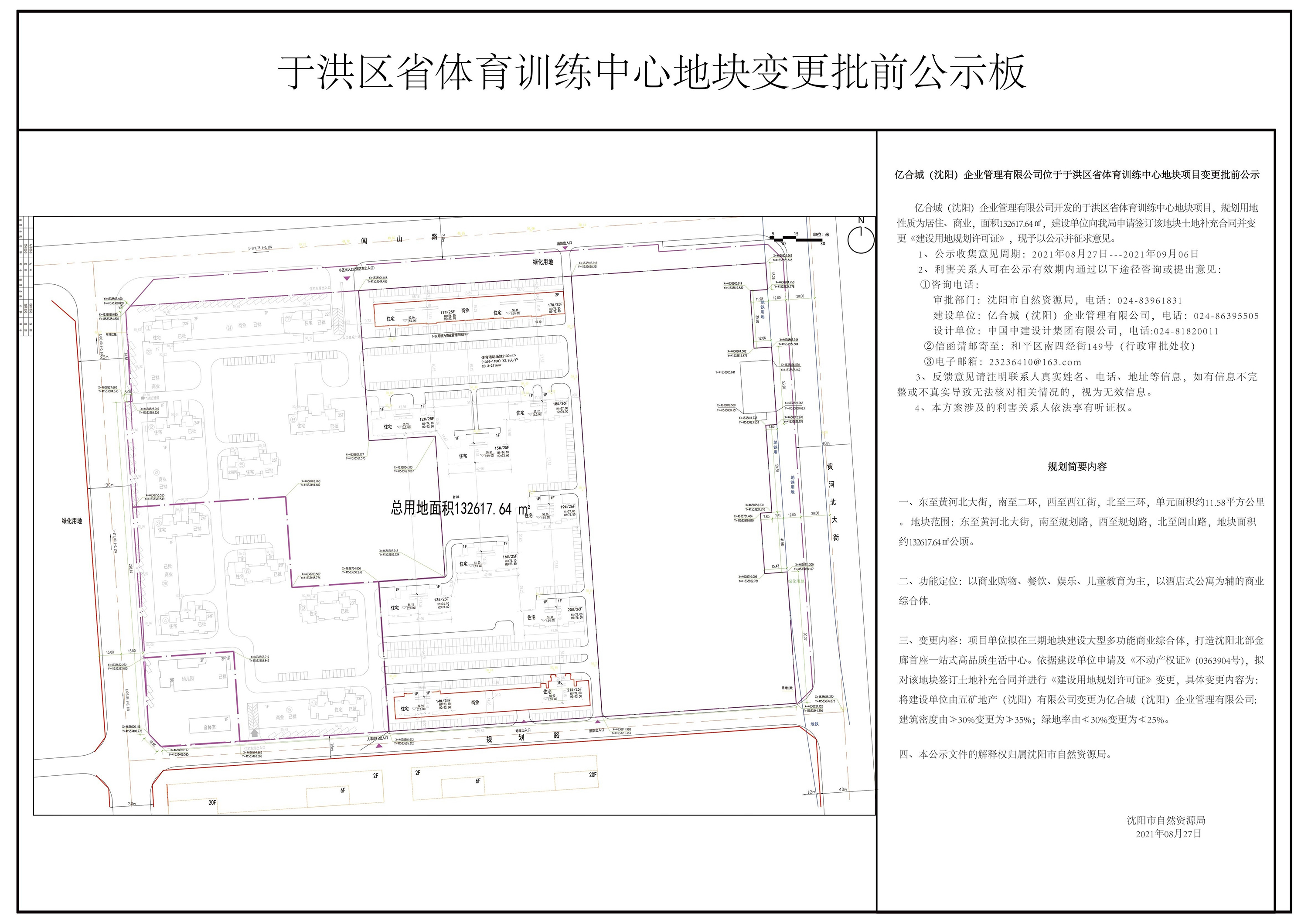 亿合城(沈阳)企业管理有限公司位于于洪区省体育训练中心地块项目变更批前公示 亿合城(沈阳)企业管理有限公司开发的位于于洪区黄河北大街138号甲的于洪区省体育训练中心地块项目,规划用地性质为居住、商业,面积132617.64㎡,因建设需求,建设单位向我局申请签订该地块土地补充合同并变更《建设用地规划许可证》,现予以公示并征求意见。 1、公示收集意见周期:2021年08月27日---2021年09月06日 2、利害关系人可在公示有效期内通过以下途径咨询或提出意见: ①咨询电话: 审批部门:沈阳市自然资源局,电话:024-83961831 建设单位:亿合城(沈阳)企业管理有限公司,电话:024-86395505 设计单位:中国中建设计集团有限公司,电话:024-81820011 ②信函请邮寄至:和平区南四经街149号(行政审批处收) ③电子邮箱:23236410@163.com 3、反馈意见请注明联系人真实姓名、电话、地址等信息,如有信息不完整或不真实导致无法核对相关情况的,视为无效信息。 4、本方案涉及的利害关系人依法享有听证权。 规划简要内容 一、东至黄河北大街,南至二环,西至西江街,北至三环,单元面积约11.58平方公里。 地块范围:东至黄河北大街,南至规划路,西至规划路,北至闾山路,地块面积约132617.64㎡公顷。 二、功能定位:商业部分以商业购物、餐饮、娱乐、儿童教育为主,以酒店式公寓为辅的商业综合体. 三、变更内容:项目单位拟在三期地块建设大型多功能商业综合体,打造沈阳北部金廊首座一站式高品质生活中心。依据建设单位申请及《不动产权证》(0363904号),拟对该地块签订土地补充合同并进行《建设用地规划许可证》变更,具体变更内容为:将建设单位由五矿地产(沈阳)有限公司变更为亿合城(沈阳)企业管理有限公司;建筑密度由≯30%变更为≯35%;绿地率由≮30%变更为≮25%。 四、本公示文件的解释权归属沈阳市自然资源局。 |