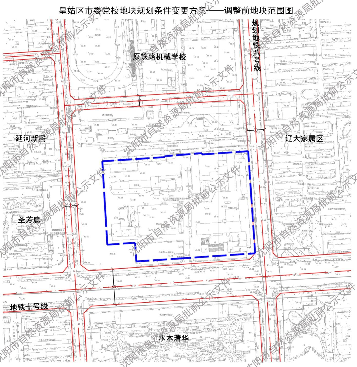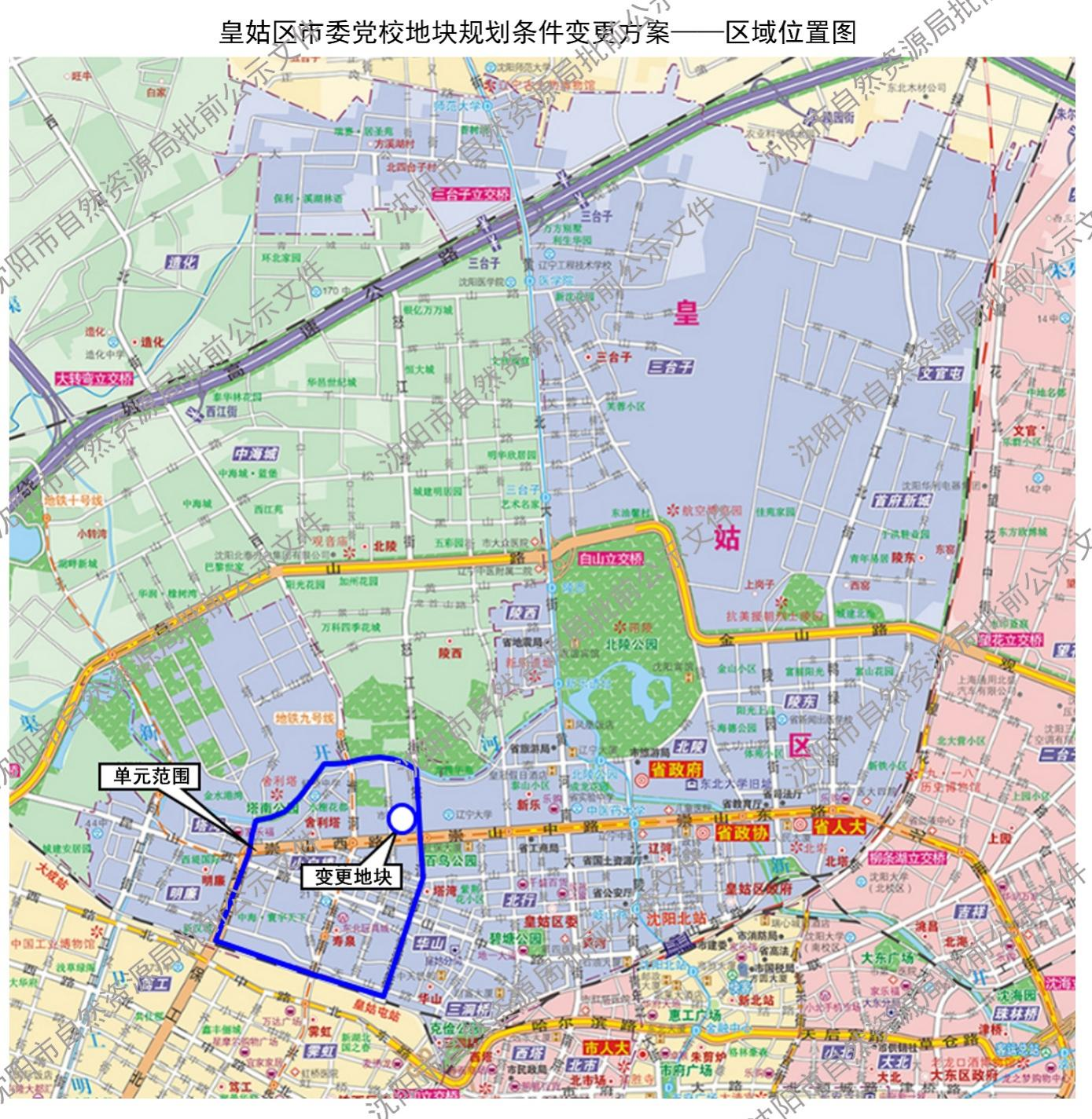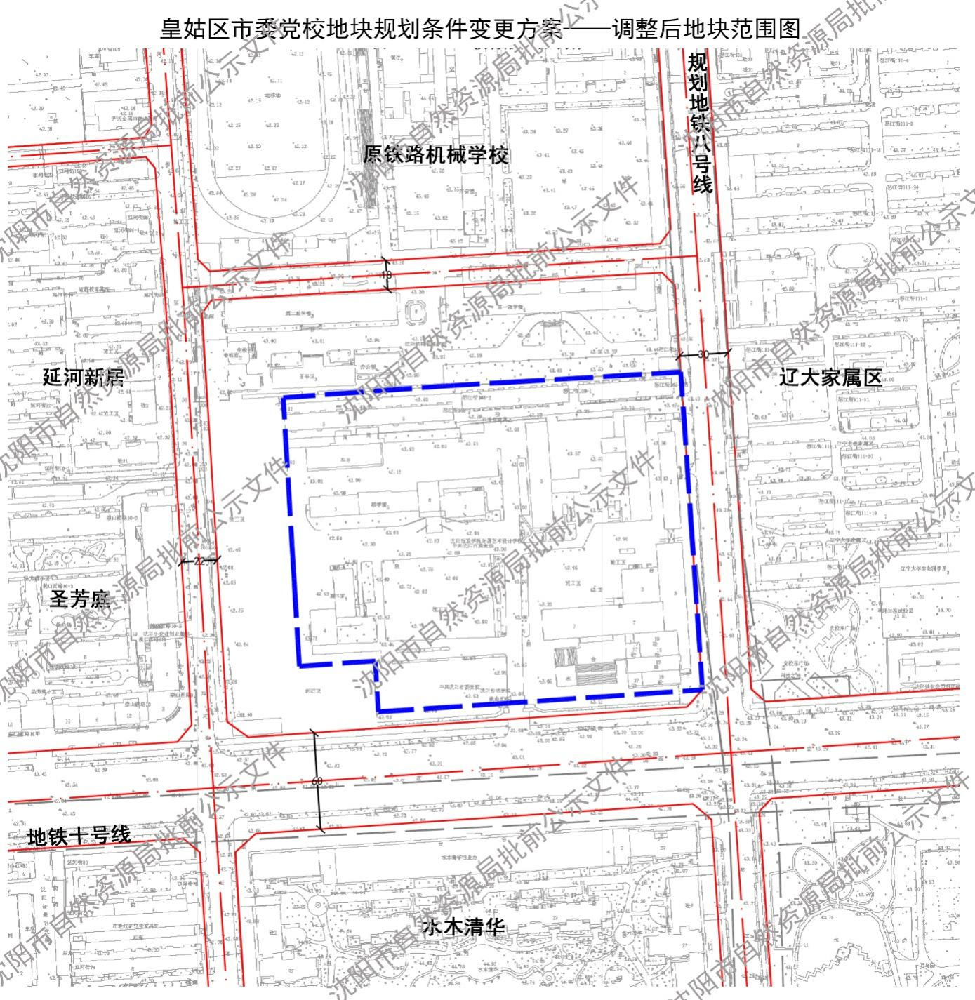 一、地块范围:东至怒江街,南至崇山西路,西至用地界线,北至用地界线。 二、变更内容:该地块于2021年12月由中铁北方投资有限公司通过沈阳市土地交易市场取得国有土地使用权,规划条件为二类居住用地、商业用地、商务办公用地,用地面积约4.12公顷,容积率不大于2.8,商业比例27%-28%,建筑密度不大于35%,绿地率不小于30%,建筑高度不大于80米。 现市委党校北侧地块(约0.61公顷)已拆迁完成,但形状较为狭长,面积较小,不具备单独开发建设条件。因此,皇姑区政府申请,将北侧已拆迁地块纳入市委党校地块出让范围。拟将用地面积由4.12公顷调整为4.73公顷,容积率由不大于2.8调整为不大于2.6,商业比例由27%-28%调整为26%-27%,其他指标保持不变。 三、本公示文件的解释权归属沈阳市自然资源局。