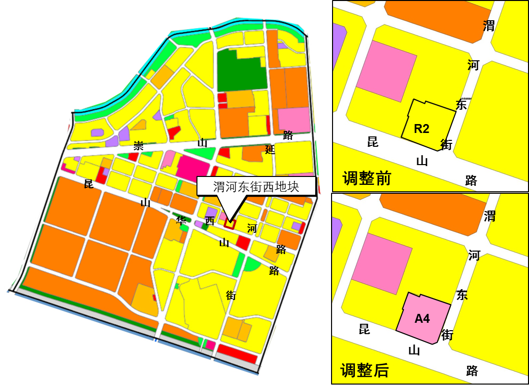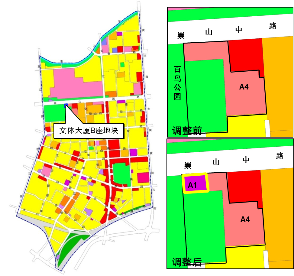 一、地块位置 拟调整地块分别为皇姑区文体大厦B座地块及渭河东街西地块,其中皇姑区文体大厦B座地块位于长江街单元,崇山路南侧。渭河东街西地块位于皇姑屯单元内,昆山西路与渭河东街交汇处西北角。 二、地块范围 皇姑区文体大厦B座地块东至用地界限,南至用地界限,西至百鸟公园,北至崇山中路,用地面积2900平方米,用地性质为体育用地。 渭河东街西地块东至渭河东街,南至昆山西路,西至用地界限,北至用地界线,用地面积2900平方米,用地性质为居住用地。 三、调整内容 将文体大厦B座地块用地性质由体育用地调整为行政办公用地; 将渭河东街西地块(2900㎡)用地性质由居住用地调整为体育用地。 (详见附图)