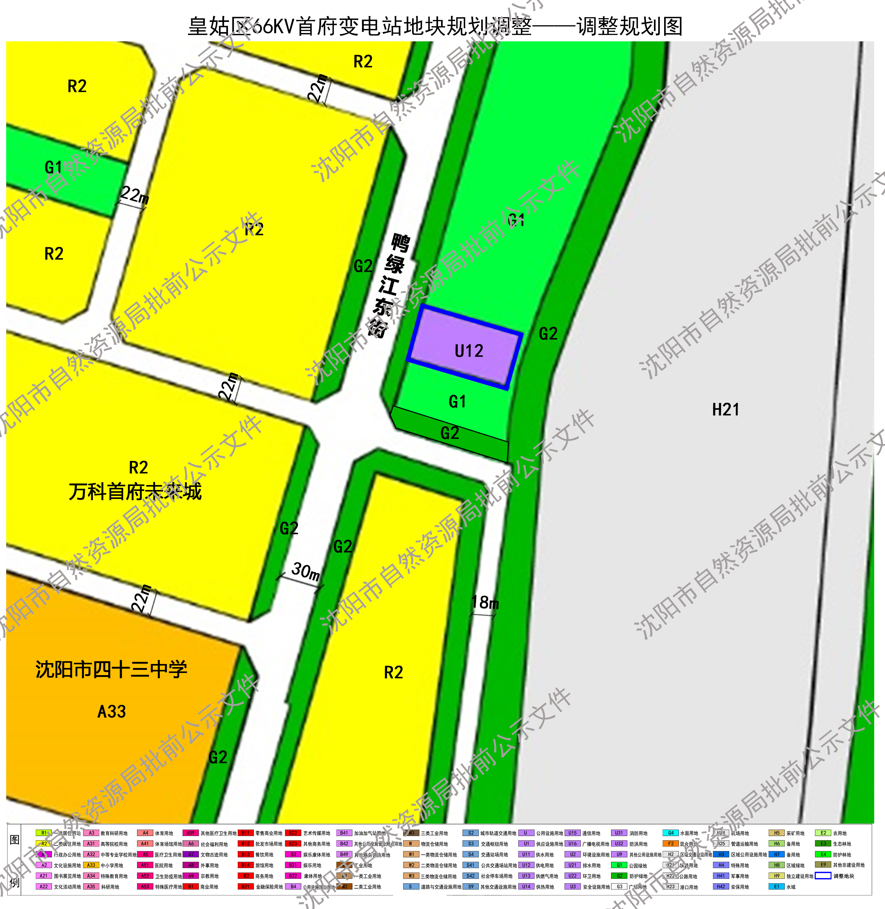 一、地块范围:东、南、西、北至用地界线。 二、调整内容:考虑变电站实际建设需求和土地高效利用,经皇姑区人民政府申请,对地块规划进行调整。 拟将原供电用地向北偏移49米,并优化布局,将面积由0.49公顷缩减至0.42公顷。将防护绿地(G2,0.15公顷)、原供电用地(U12,0.07公顷)调整为公园绿地(G1,0.22公顷),绿地总量增加0.07公顷,为居民游憩提供更多活动空间。 三、本公示文件的解释权归属沈阳市自然资源局。