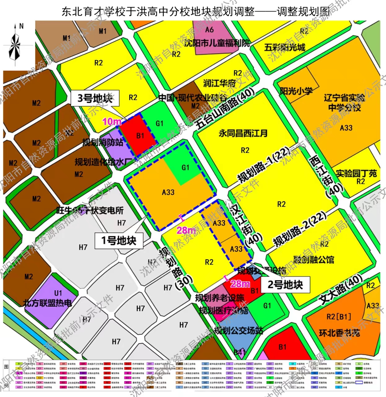 东北育才学校于洪高中分校地块调整范围位于《旺牛南单元、高力单元控制性详细规划》(INWN、INGL),该规划于2018年8月通过市政府批准。按照《中华人民共和国城乡规划法》及相关法律、法规要求,现将该地块用地规划调整进行批前公示,征询公众意见,公示时间为30日(自2024年4月16日至2024年5月15日)。在此期间如有意见或建议可通过以下途径参与,并注明联系人及具体联系方式。利害关系人对该规划依法享有陈述、申辩以及申请听证等权利,逾期视为放弃上述权利。 1.电子邮件:yhfjghk-zrzyj@shenyang.gov.cn 2.传真:31013903(沈阳市自然资源局于洪分局) 3.信函:请邮寄至沈阳市于洪区沈大路63号,沈阳市自然资源局于洪分局收,邮编:110141。 沈阳市自然资源局 2024年4月16日 规划简要内容 一、地块范围:调整地块位于于洪区造化街道,丹阜高速以东,文大路以北,沈北西路以南。 二、调整内容:为解决于洪区普通高中优质资源不足的问题,拟将1号地块由居住用地(10.19公顷)、中小学用地(5.23公顷)调整为中小学用地(12.19公顷)和公园绿地(3.23公顷);2号地块由居住用地(5.23公顷)调整为中小学用地(5.23公顷);3号地块由公园绿地(3.23公顷)调整为商业用地(2.99公顷)、防护绿地(0.24公顷)。考虑学校周边行人及车辆顺畅通行,将22米规划路-1、22米规划路-2的局部红线宽度由22米调整为28米。 三、本公示文件的解释权归属沈阳市自然资源局。