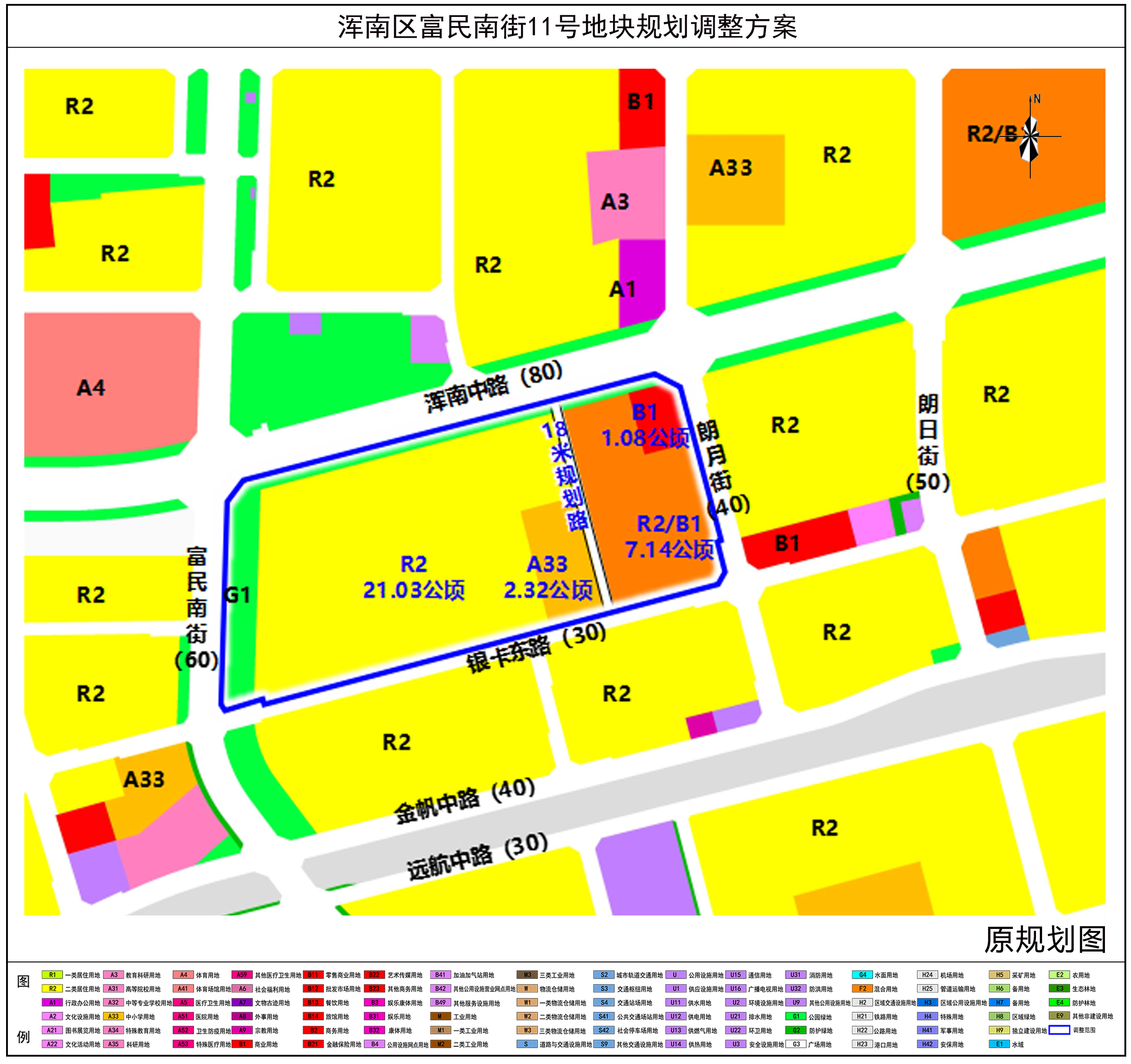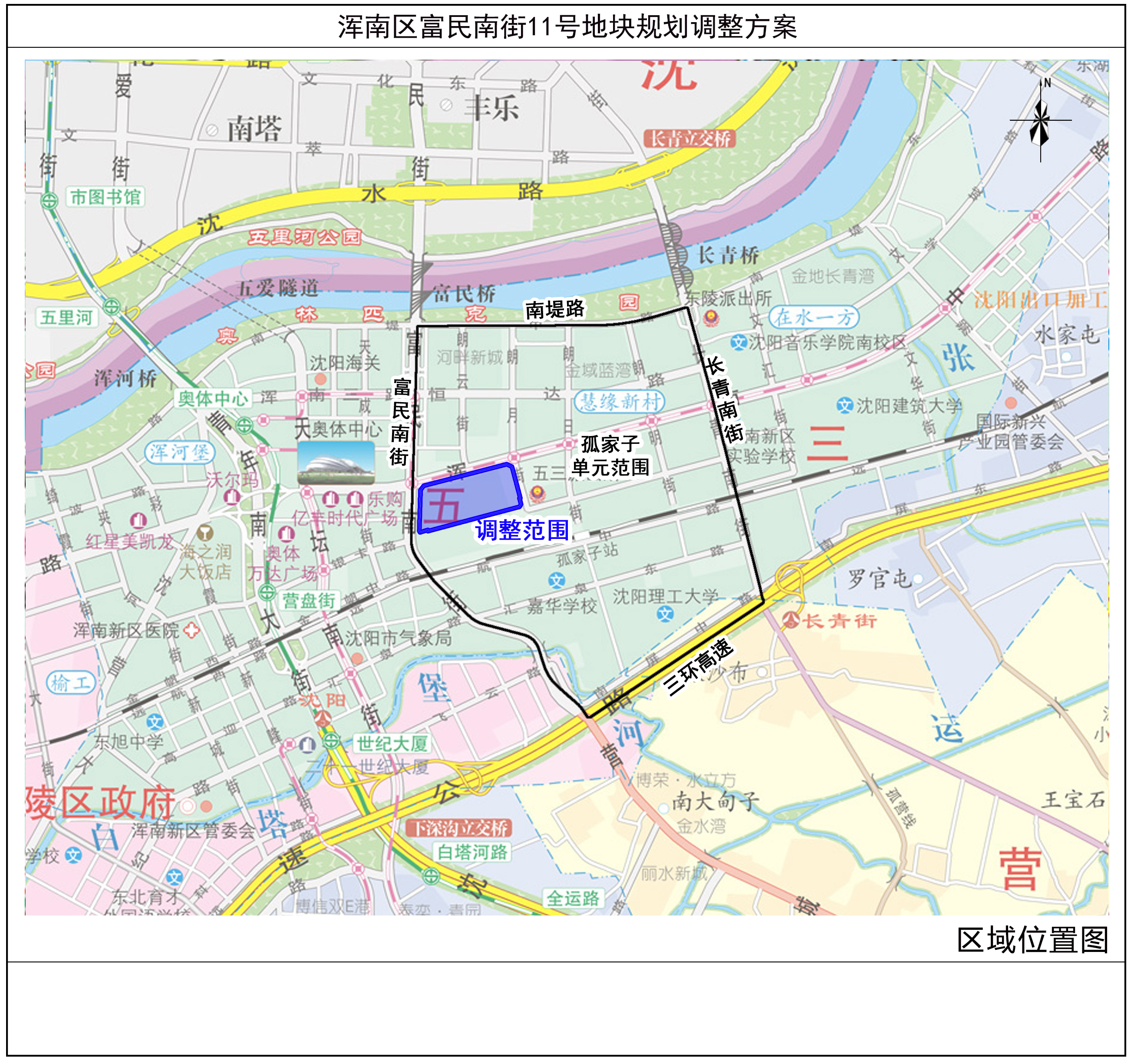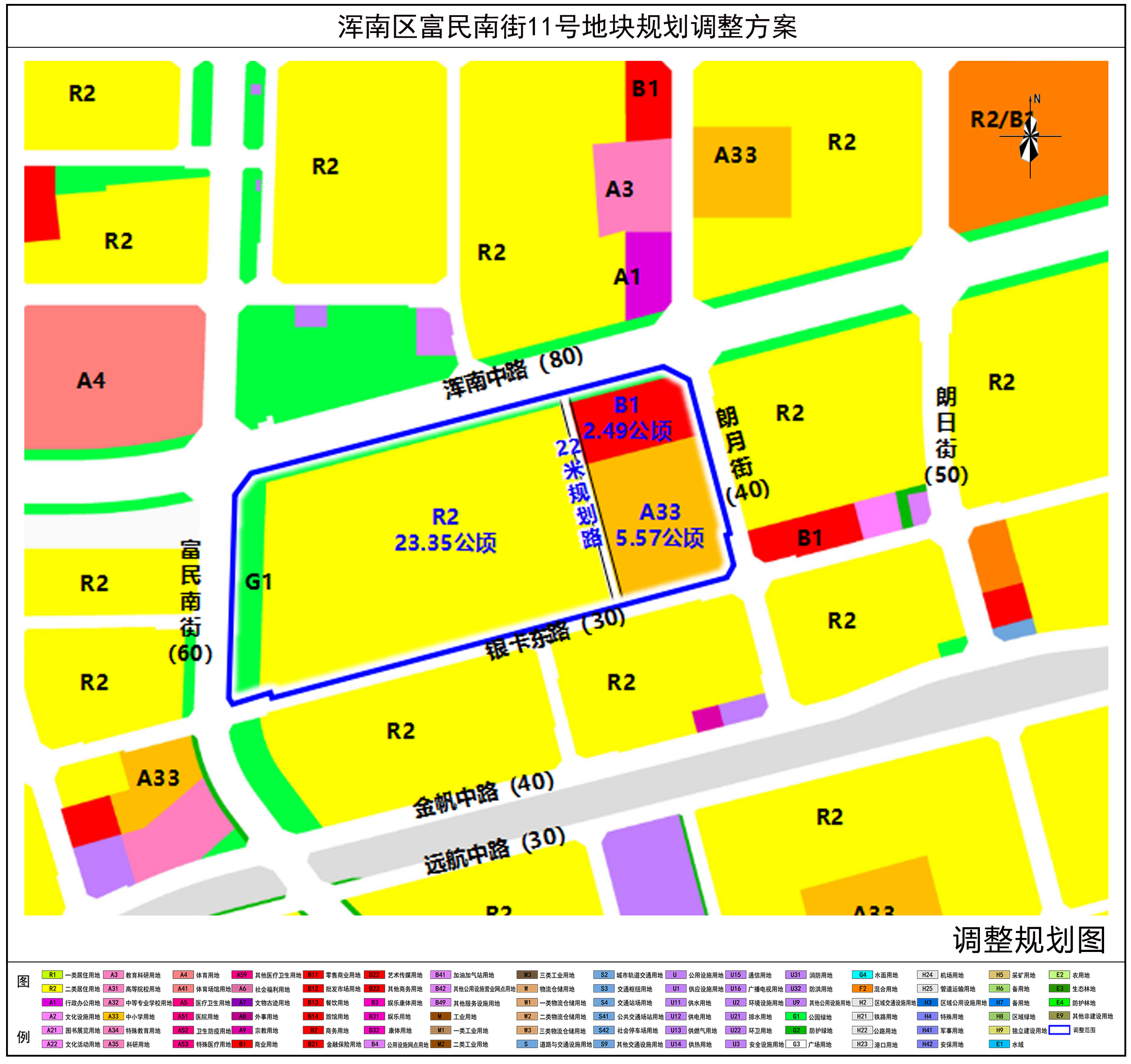 浑南区富民南街11号地块位于浑南区五三街道,《沈阳市中心城区孤家子单元(编码GNGJ)控制性详细规划》控规单元内,该规划于2023年3月通过市政府批准。按照《中华人民共和国城乡规划法》及相关法律、法规要求,现将浑南区富民南街11号地块规划调整方案进行批前公示,征询公众意见,公示时间为30个自然日(自2025年7月2日至2025年7月31日)。在此期间,如有意见或建议可通过以下途径参与,并注明联系人及具体联系方式。利害关系人对该规划依法享有陈述、申辩以及申请听证等权利,逾期视为放弃上述权利。 1.电子邮件:hnghk-zrzyj@shenyang.gov.cn(沈阳市自然资源局浑南分局)。 2.传真:024-23786028(沈阳市自然资源局浑南分局)。 3.信函:请邮寄至沈阳市浑南区世纪路15号,沈阳市自然资源局浑南分局收,邮编:110000。 沈阳市自然资源局 2025年7月2日 规划简要内容 一、地块范围: 调整区域东至朗月街、南至银卡东路、西至富民南街、北至浑南中路,调整面积约36.20公顷。 二、调整内容: 为缓解区域就学紧张压力,优化周边路网,现将本次调整内容公示如下: 1、将原规划24班小学向东移至东侧地块,并增加一所30班初中。 2、考虑中小学上下学时段交通拥堵问题,将18米规划路调整为22米。 3、优化商业用地布局,保持居住规模不变,区域规划人口不变。 三、本公示文件的解释权归属沈阳市自然资源局。 附图: 1.区域位置图 2.原规划图 3.调整规划图