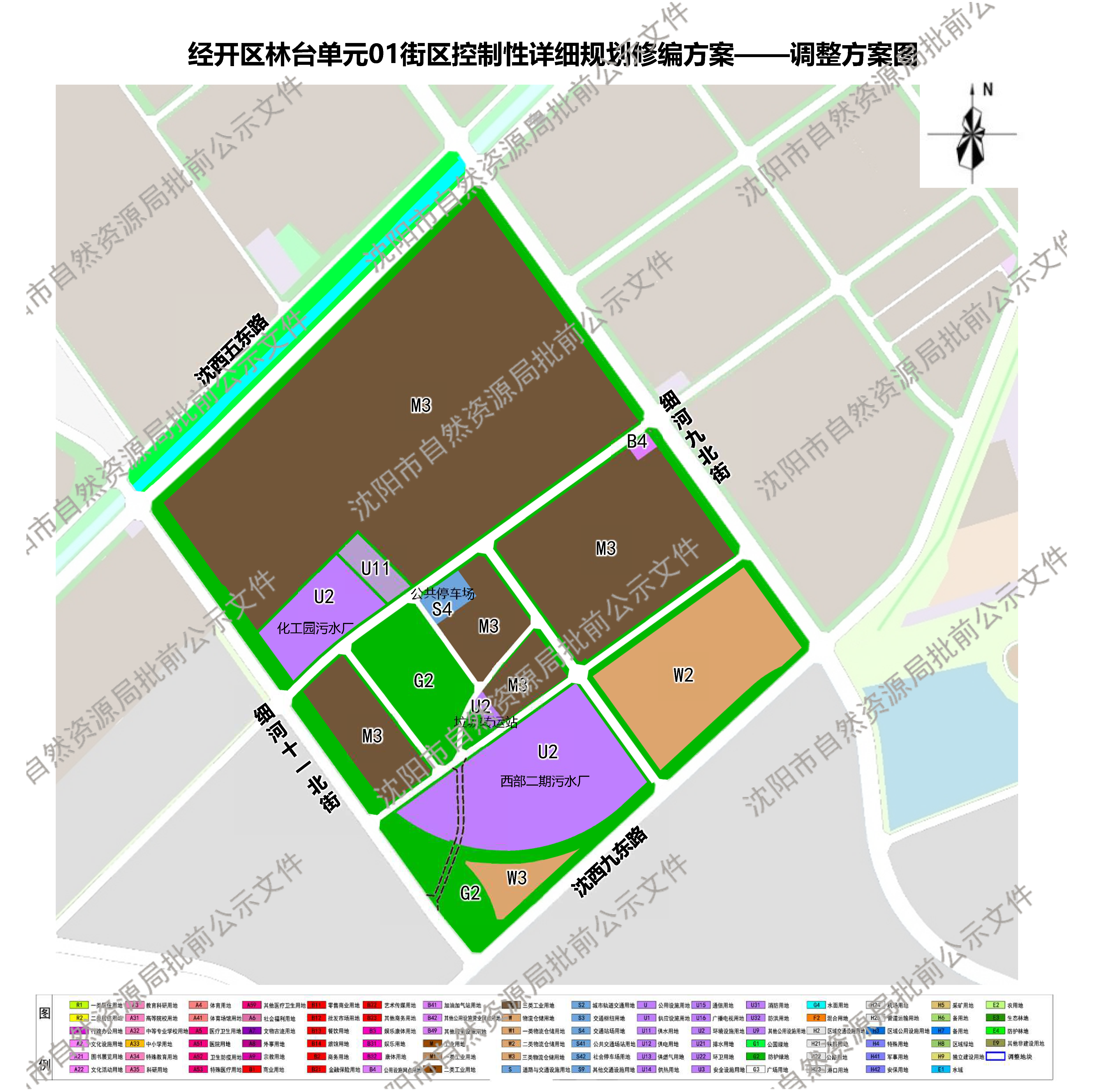 《沈阳市中心城区林台单元控制性详细规划》(单元编号:ENLT),该规划于2020年1月通过市政府批准。按照《中华人民共和国城乡规划法》及相关法律、法规要求,现将该单元01街区控制性详细规划修编方案进行批前公示,征询公众意见,公示时间为30日(自2025年12月8日至2026年1月6日)。在此期间如有意见或建议可通过以下途径参与,并注明联系人及具体联系方式。利害关系人对该规划依法享有陈述、申辩以及申请听证等权利,逾期视为放弃上述权利。 1.咨询电话:25373279(沈阳市自然资源局经济技术开发区分局) 2.信函:请邮寄至沈阳经济技术开发区中央大街27号 沈阳市自然资源局经济技术开发区分局规划科收,邮编:114012 3.电子邮件: zrzyjkfjghk-txq@shenyang.gov.cn 沈阳市自然资源局 2025年12月8日 规划简要内容 一、规划范围:东至细河九北街、南至沈西九东路、西至细河十一北街、北至沈西五东路,用地面积约3.2平方公里。 二、用地方案: 结合化工园再生水厂和绿地工程项目两处建设项目,优化街区内规划用地方案:污水厂东侧的再生水厂项目用地由三类工业用地调整为供水用地(U11),并在地块周边控制10米防护绿带;结合绿地工程项目和既有道路将原规划中的预留地控制为防护绿地(G2)和三类工业用地(M3),并优化该区域道路布局。 三、五线控制:红线控制包括细河九北街、沈西六东路、沈西九东路和细河十一北街等主干路,沈西十一东路和细河十北街两条次干路,其他为支路;绿线控制包括公园绿地、防护绿地。黄线控制包括污水厂、再生水厂等。蓝线控制片区内浑蒲灌渠水面。 四、本公布文件的解释权归属沈阳市自然资源局。