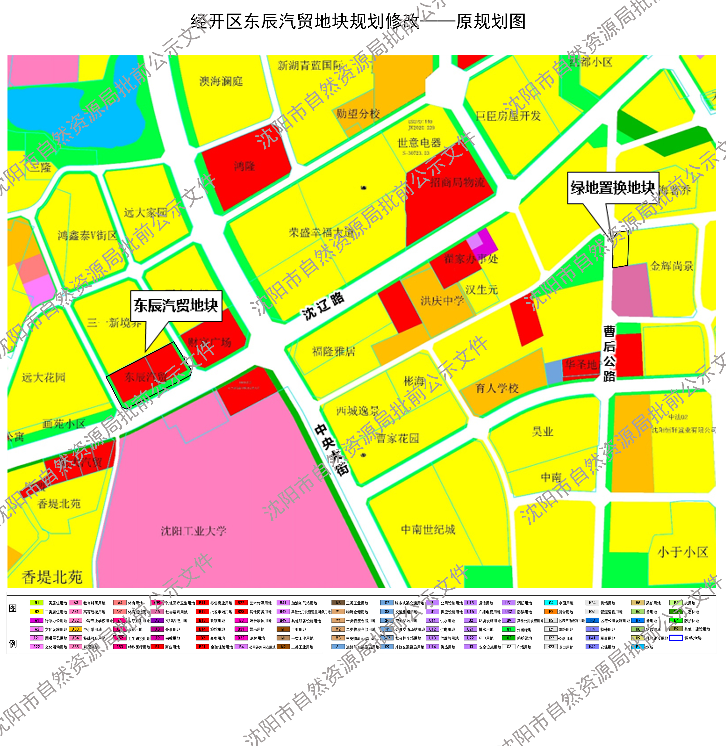 经开区东辰汽贸地块位于《化院控制性详细规划》(编号ENHY),该规划于2020年8月通过市政府批准。按照《中华人民共和国城乡规划法》及相关法律、法规要求,现将经开区东辰汽贸地块规划修改方案进行批前公示,征询公众意见。公示时间为30天(自2026年2月10日至2026年3月11日)。在此期间,如有意见或建议可通过以下途径参与,并注明联系人及具体联系方式。利害关系人对该规划依法享有陈述、申辩以及申请听证等权利,逾期视为放弃上述权利。 1.咨询电话:25373279(沈阳市自然资源局经济技术开发区分局) 2.信函:请邮寄至沈阳经济技术开发区中央大街27号 沈阳市自然资源局经济技术开发区分局规划管制科收,邮编:110000 3.电子邮件: zrzyjkfjghk-txq@shenyang.gov.cn 沈阳市自然资源局 2026年2月10日 规划简要内容 一、调整范围:拟调整地块位于经开区沈辽路北侧,地块范围内全部为东辰汽贸企业权属。 二、调整方案:经开区申请将沈辽路沿线东辰汽贸权属范围内南侧绿化带宽度由原30米调整为10米,取消权属内东西侧绿化带,将原公园绿地约0.5公顷调整为商业用地,曹后公路东侧、金辉尚景小区权属西侧0.5公顷居住用地调整为公园绿地,调整后绿地总量不变。 三、本公示文件的解释权归属沈阳市自然资源局。