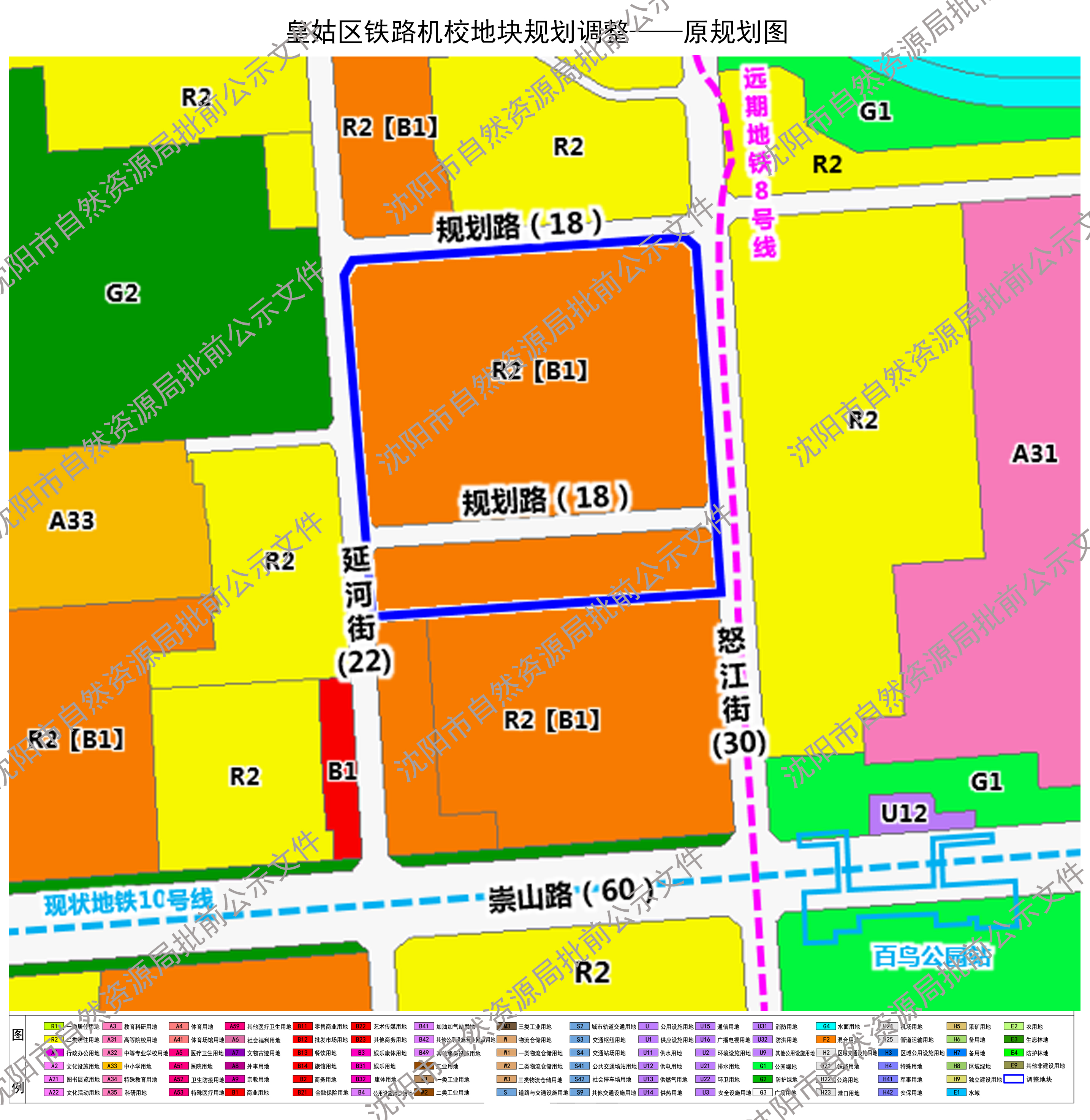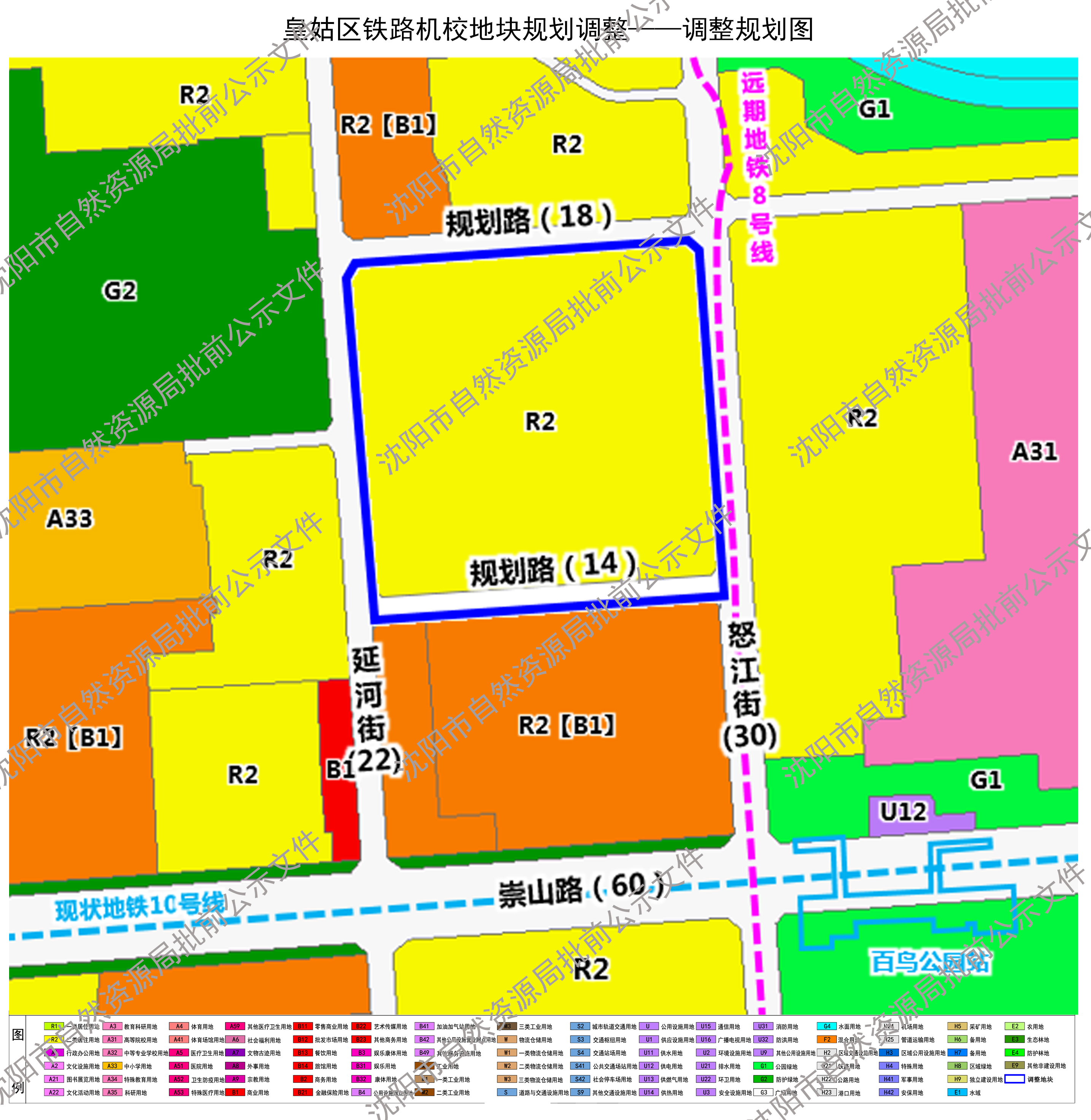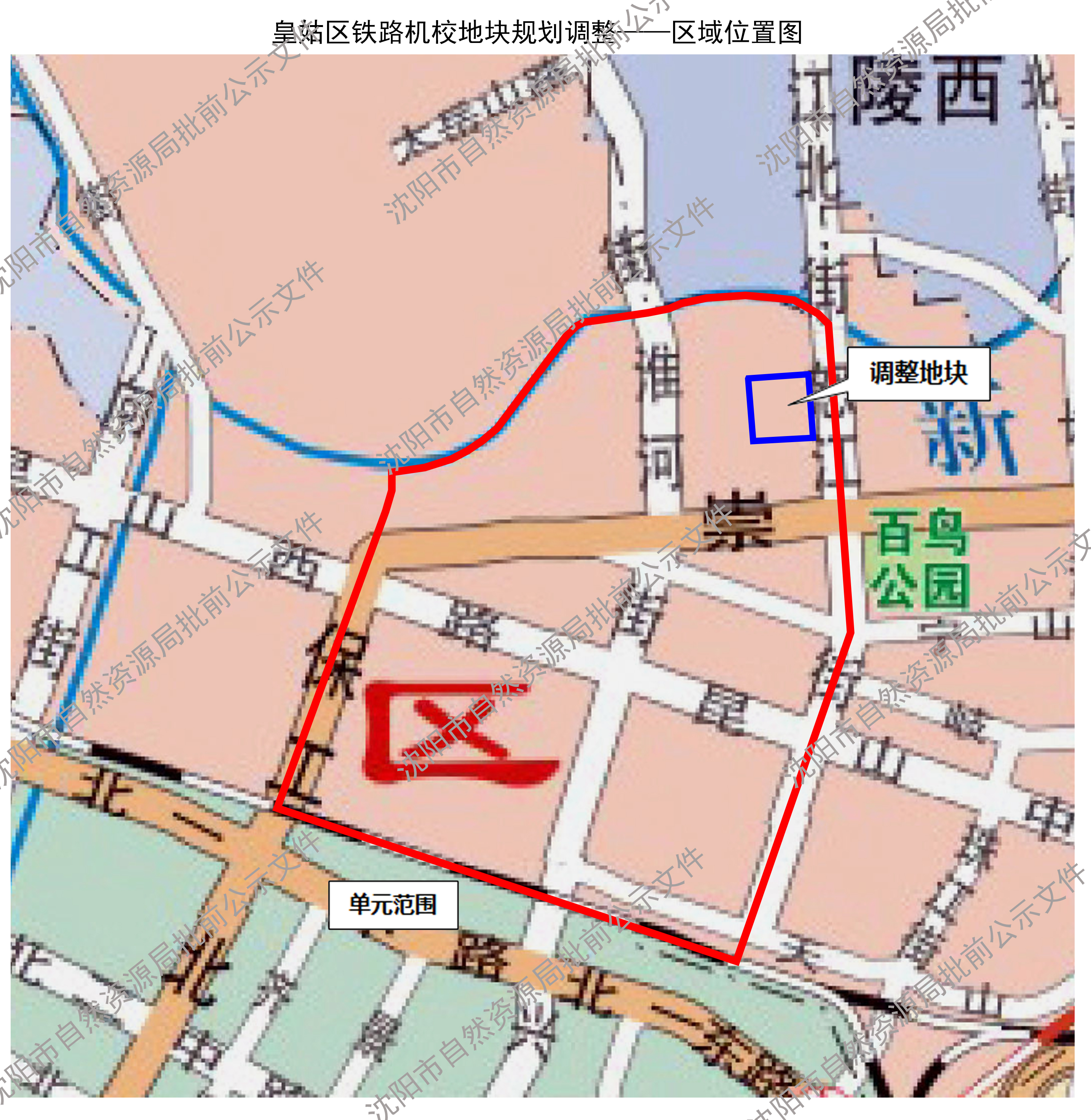 皇姑区铁路机校地块位于《皇姑屯单元控制性详细规划》(单元编号:DNHG),该规划于2013年3月通过市政府批准。按照《中华人民共和国城乡规划法》及相关法律、法规要求,现将该地块规划调整进行批前公示,征询公众意见,公示时间为30日(自2026年4月13日至2026年5月12日)。在此期间如有意见或建议可通过以下途径参与,并注明联系人及具体联系方式。利害关系人对该规划依法享有陈述、申辩以及申请听证等权利,逾期视为放弃上述权利。 1.电子邮件:hgghk-zrzyj@shenyang.gov.cn 2.电话:024-22815467(沈阳市自然资源局皇姑分局) 3.信函:请邮寄至沈阳市皇姑区松花江街3号,沈阳市自然资源局皇姑分局收,邮编:110032 沈阳市自然资源局 2026年4月13日 规划简要内容 一、单元范围:东至怒江街,西至塔湾街,南至沈山铁路,北至新开河,单元用地面积约450公顷。 二、地块范围:东至怒江街西侧道路红线,南至用地界线,西至延河街东侧道路红线,北至18米规划路南侧道路红线,占地面积约9.04公顷。 三、调整内容:为盘活闲置土地,提升区域资源配置,经皇姑区申请,拟将铁路机校地块规划用地性质由居住与商业混合用地(R2【B1】)和城市道路用地(S1)调整为二类居住用地(R2)和城市道路用地(S1),将规划道路位置南移至地块边界,红线宽度由18米调整为14米。 四、本公示文件的解释权归属沈阳市自然资源局。