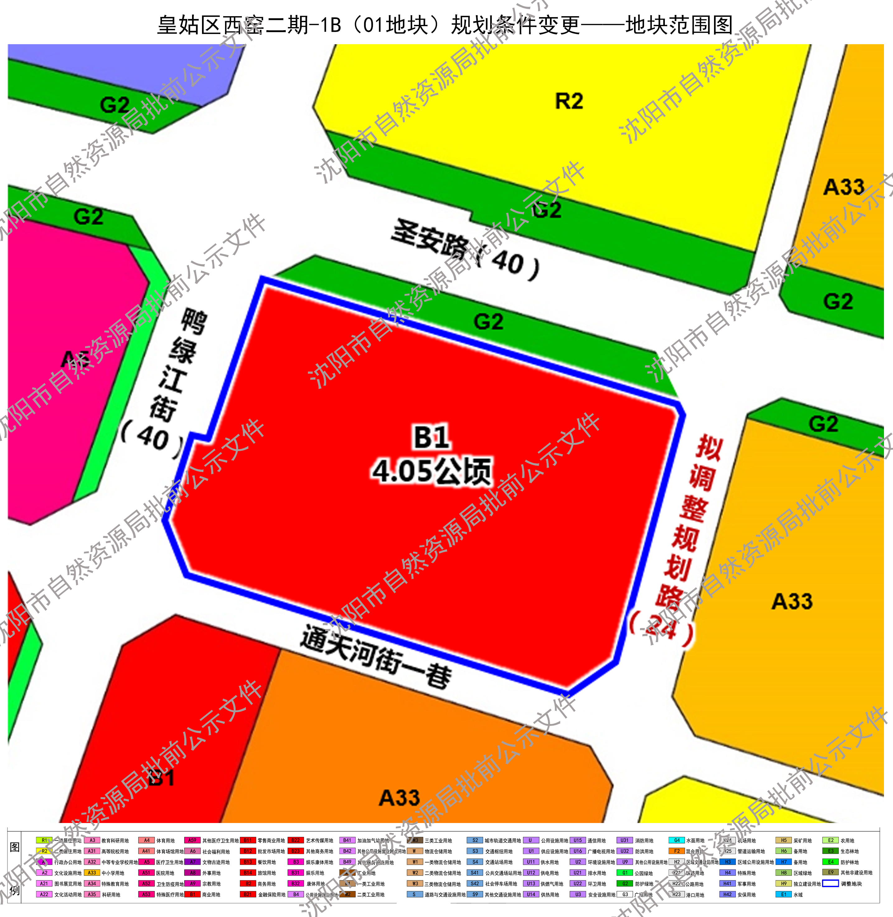 皇姑区西窑二期-1B(01地块)位于《陵园单元控制性详细规划》(单元编号:DNLY),该规划于2023年2月通过市政府批准。按照《中华人民共和国城乡规划法》及相关法律、法规要求,现将该地块规划条件变更进行批前公示,征询公众意见,公示时间为7个工作日(自2026年4月15日至2026年4月23日)。在此期间如有意见或建议可通过以下途径参与,并注明联系人及具体联系方式。利害关系人对该规划依法享有陈述、申辩以及申请听证等权利,逾期视为放弃上述权利。 1.电子邮件:hgghk-zrzyj@shenyang.gov.cn 2.电话:024-22815467(沈阳市自然资源局皇姑分局) 3.信函:请邮寄至沈阳市皇姑区松花江街3号,沈阳市自然资源局皇姑分局收,邮编:110032 沈阳市自然资源局 2026年4月15日 规划简要内容 一、地块范围:东至规划路西侧道路红线,南至现状路北侧道路红线,西至鸭绿江街东侧道路红线,北至规划绿线,占地面积约4.05公顷。 二、调整内容:为落实大型商业综合体项目,激发地块周边经济活力,经皇姑区申请,拟将地块用地性质由商业用地(B1)和居住与商业混合用地(R2【B1】)调整为商业用地(B1);用地面积由4.16公顷调整为4.05公顷;容积率由不大于2.0调整为不大于1.0;建筑密度由不大于30%调整为不大于50%;绿地率由不小于25%调整为不小于10%;商业比例由49%-50%调整为100%;建筑高度由不大于60米调整为不大于30米。 三、本公示文件的解释权归属沈阳市自然资源局。