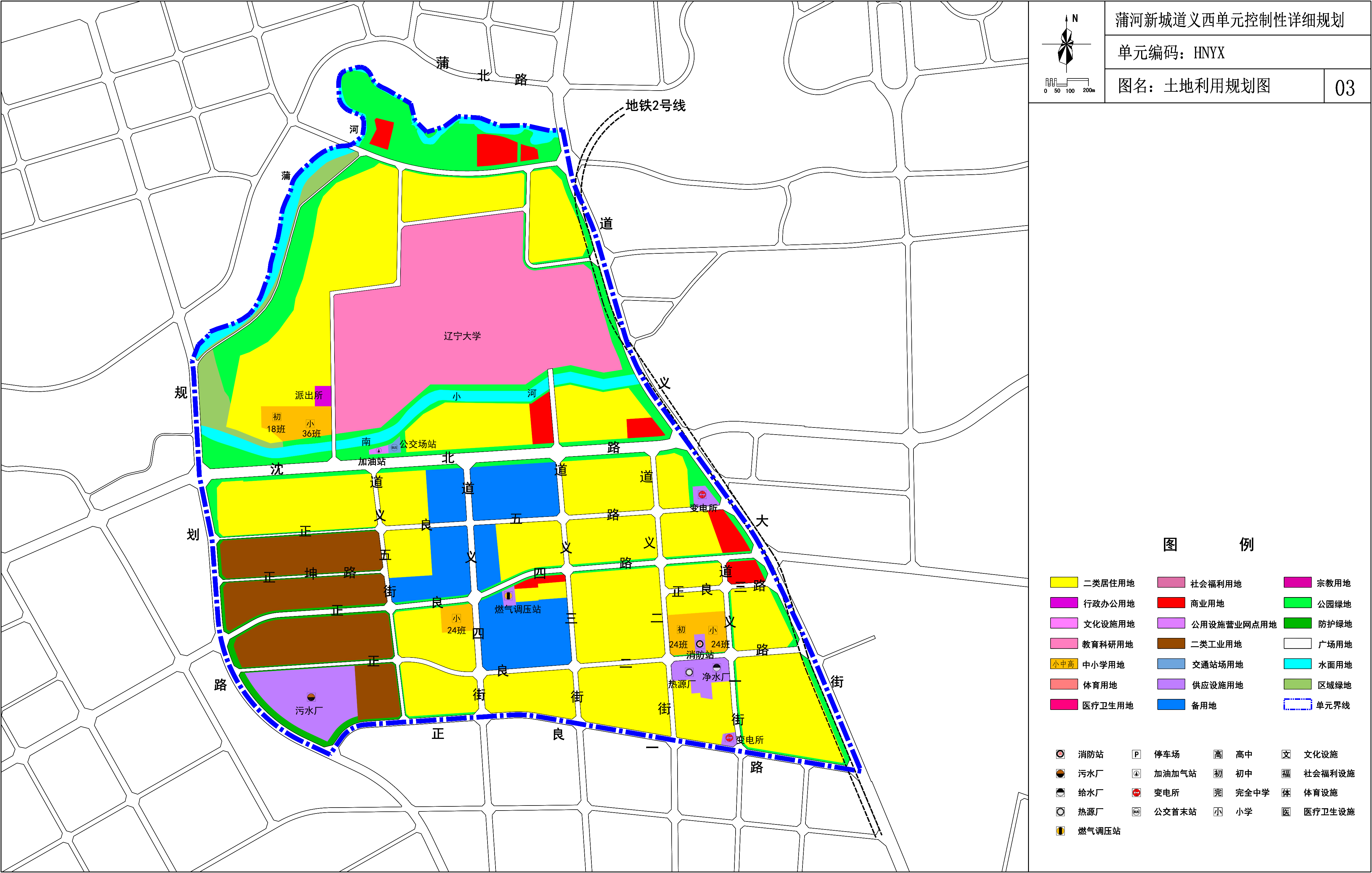 项目名称:沈北新区道义西单元控制性详细规划 公示组织单位:沈阳市规划和国土资源局沈北分局 规划编制单位:沈阳市规划设计研究院 按照《中华人民共和国城乡规划法》有关规定,现就沈北新区道义西单元控制性详细规划进行公示,征询公众意见,欢迎广大市民积极参与,提出宝贵意见。 公示时间:2018.4.18-2018.5.19 咨询电话:88048848(市规划国土局沈北分局) 23225490(市规划国土局城乡规划管理处) 意见反馈方式: 1.发送电子邮件至:syghgongshi@163.com 2.邮寄书面意见至:沈阳市规划和国土资源局,地址:沈阳市和平区南四经街149号,城乡规划管理处收,邮编:110003 反馈意见请注明联系人及具体联系方式。 2018年4月18日 规划简要内容 一、规划范围 规划四至范围:东至道义大街,南至正良一路,西至规划路,北至蒲河,总用地面积6.2平方公里。 二、功能定位 规划道义西单元功能定位为沈阳市蒲河新城南部现代化的城市居住片区、大学城。 三、用地布局 居住用地为二类居住用地,占区域大部分;规划公共管理与公共服务设施用地主要为行政办公、教育科研;规划商业服务业设施用地包括商业、公共设施营业网点用地,主要分布在道义大街沿线地区;规划工业用地为二类工业用地,分布在道义五街西侧;道义四街两侧有部分备用地。 四、五线控制 绿线控制包括公园绿地、防护绿地等。黄线控制包括地铁二号线线位及站点,公交首末站,加油加气站,供热,供电,燃气,通信,给水,排水等。红线控制包括主干路道义大街、沈北路,次干路道义四街,其他为支路。 (详见附图)