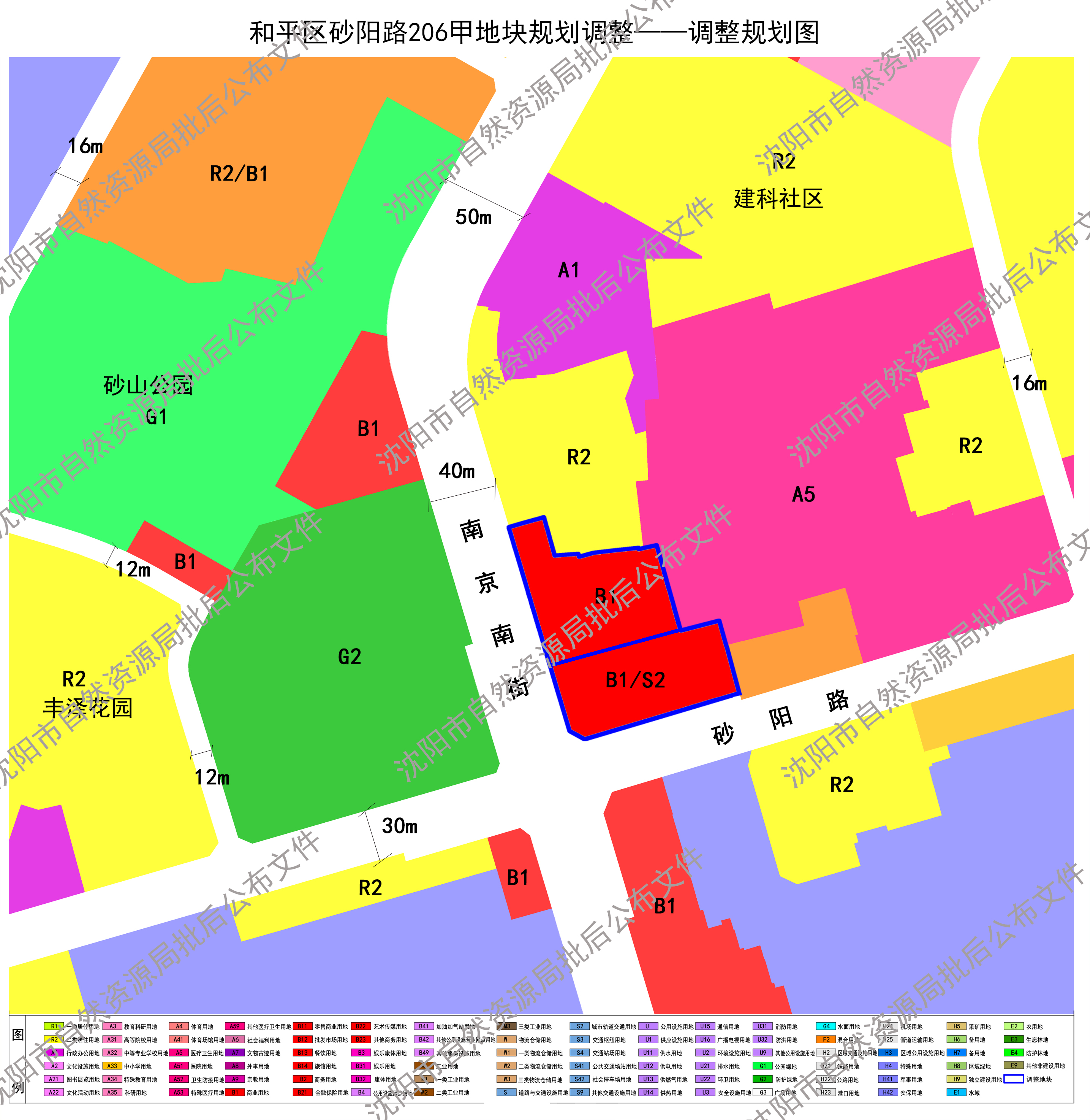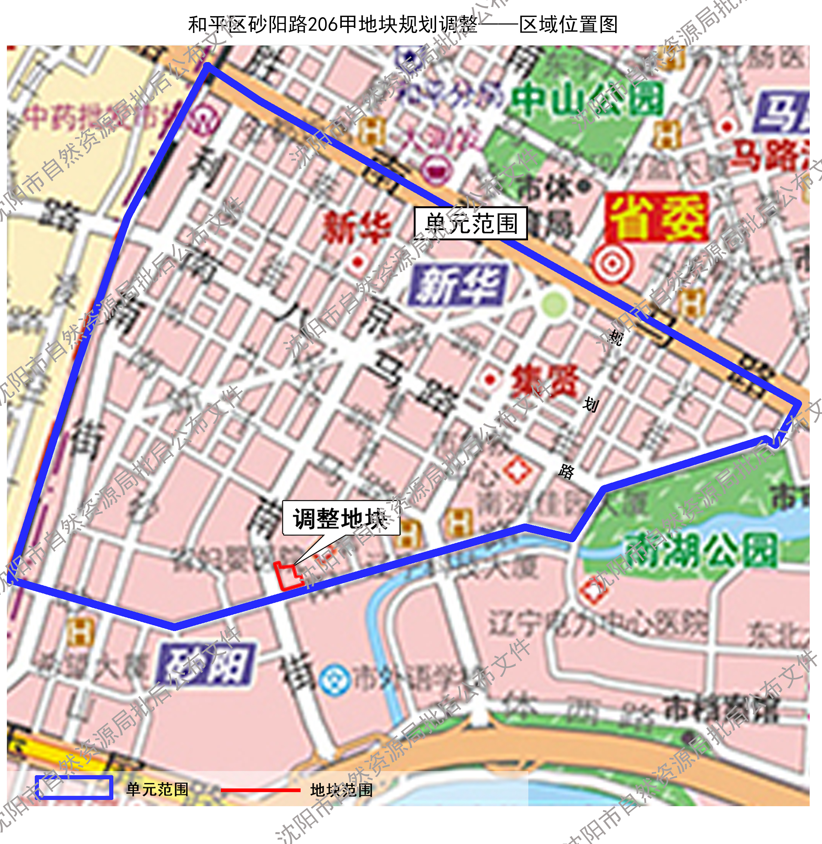 和平区砂阳路206甲地块规划调整方案于2025年7月10日获得了市政府批准,现进行批后公布。 沈阳市自然资源局 2025年7月28日 规划简要内容 一、单元范围:东至方形广场,南至砂阳路,西至长大铁路、北至南五马路,单元面积357.49公顷。 二、地块范围:东至用地界线,南至砂阳路,西至南京南街,北至用地界线,用地面积约0.96公顷。 三、调整内容:将地块(0.96公顷)由商住混合用地(R2/B1)调整为商业用地(B1);其中,南地块(0.46公顷)兼容轨道交通用地(B1/S2),北地块用地面积0.50公顷。 四、本公布文件的解释权归属沈阳市自然资源局。
