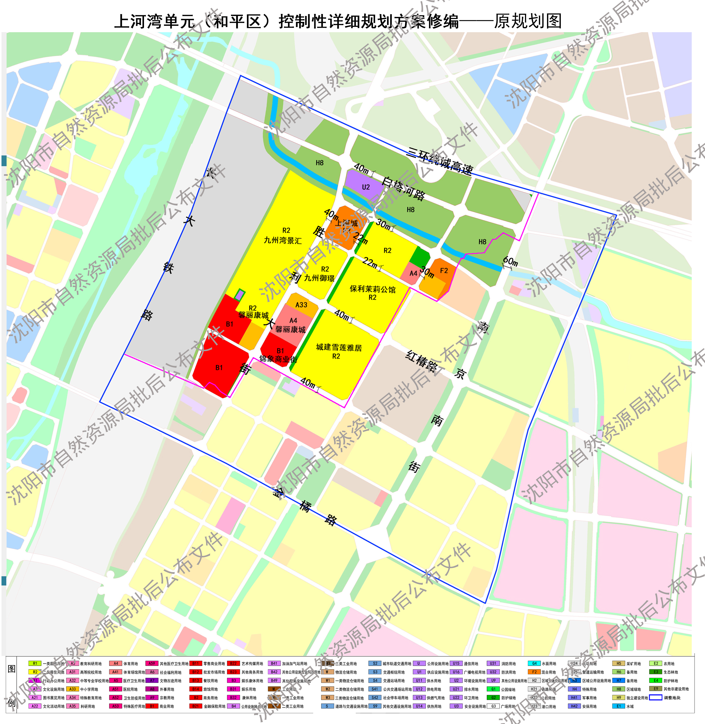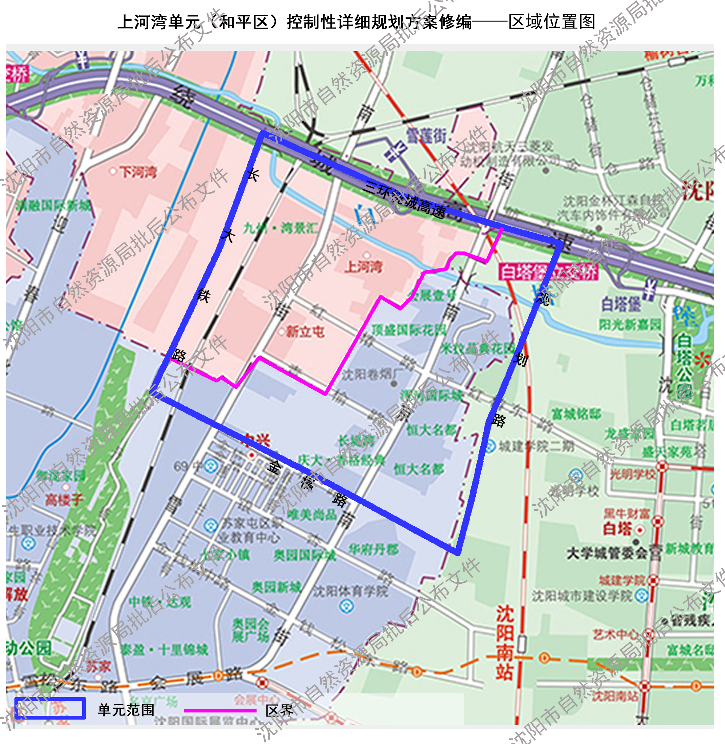 上河湾单元(和平区)控制性详细规划方案修编于2025年7月10日获得了市政府批准,现进行批后公布。 沈阳市自然资源局 2025年7月28日 规划简要内容 一、规划范围:东、南至苏家屯区界,西至长大铁路,北至三环高速路,用地面积约3.9平方公里。 二、规划定位:上河湾单元(和平区)功能定位为设施完善、环境优良的高品质居住生活区。 三、用地布局: 重点优化白塔堡河和胜利大街沿线用地布局,居住用地布局在片区中部及西部,同时落实安置房及保障房用地选址需求。公共管理与公共服务设施用地主要为中小学用地、体育用地,布局在地区中部及北部。商业服务业设施用地布局在胜利大街、白塔堡河沿线。绿地与广场用地布局方面,保持三环绿带连续,结合白塔堡河,打造大型城市公共开敞空间,同时结合街角空间新建(改造)口袋公园。 四、五线控制:红线控制包括高速路三环绕城高速,快速路胜利大街,主干路南京南街、红椿路、金橘路等,其他为支路。绿线控制包括公园绿地、防护绿地。黄线控制包括运营地铁四号线、规划地铁十二号线、规划地铁十三号线线位及站点,给水厂,雨水泵站、污水泵站、污水处理等。蓝线控制为片区内白塔堡河水面。 五、本公布文件的解释权归属沈阳市自然资源局。
