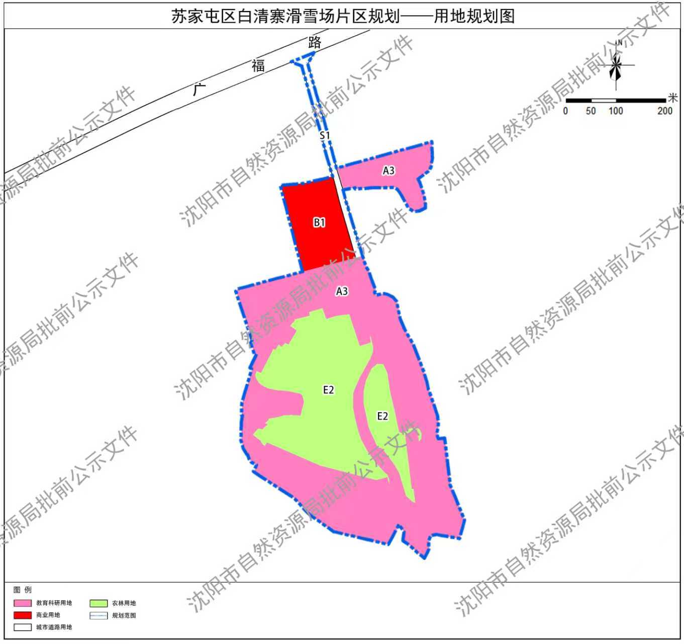 沈阳市自然资源局 2025年11月5日 规划简要内容 一、规划范围 苏家屯区白清寨滑雪场片区规划范围东、西、南至用地界线,北至广福路,总用地面积约22.22公顷。 二、规划定位 作为”十五冬“赛事承载地、沈阳市冰雪旅游支撑地,将白清寨滑雪场片区打造为集专业教学、竞技训练与社会服务于一体的多功能现代化滑雪基地。 三、规划布局 1.功能布局 滑雪场包含体育学院滑雪训练场地、商业服务设施、现状林地三大主要功能。 体育学院滑雪训练场地:造雪系统、服务配套设施、雪场等功能。 商业设施:服务滑雪场餐饮、停车等商业配套功能。 现状林地:保留规划范围中部林地。 2.用地布局 建设用地包含教育科研用地(兼容体育用地)、道路用地和商业用地。 非建设用地包含农林用地。 四、五线控制 红线控制包括广福路和12米规划路。 五、本公示文件的解释权归属沈阳市自然资源局。 附图: 1.区位图 2.用地规划图