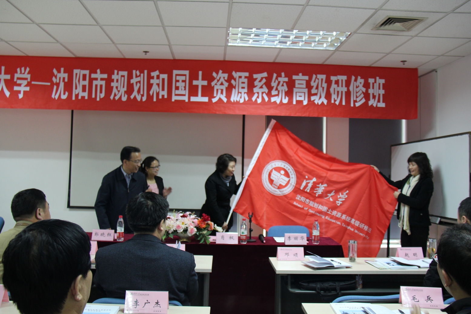 4月6日上午,由我局和清华大学继续教育学院共同组织的沈阳市规划和国土资源系统高级研修班第一期培训在清华大学正式开课。在开班仪式上,清华大学继续教育学院培训部部长郎晓红致欢迎辞,并代表清华继续教育学院向培训班授予了班旗。局党组副书记、副局长肖枫作动员讲话,局建设工程管理处处长赵明代表全体学员作了表态发言。