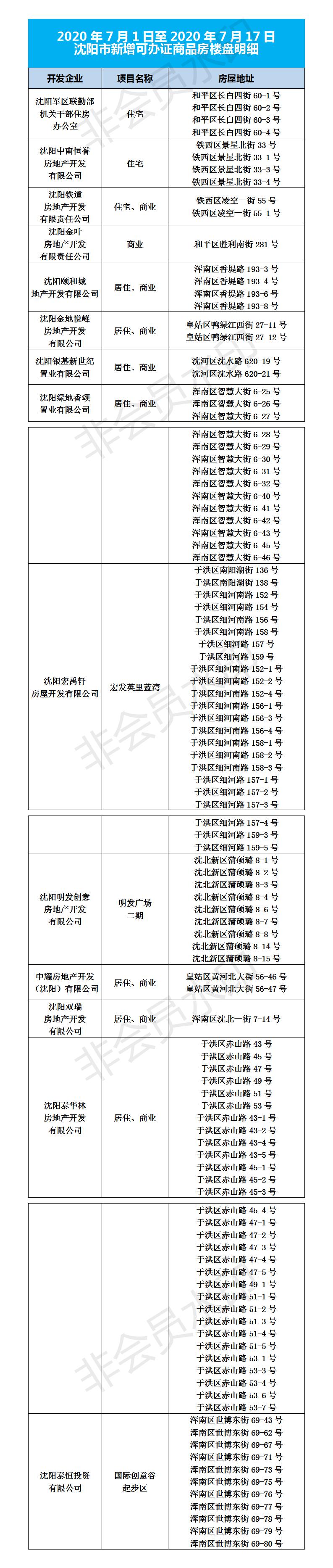 2020年7月1日至7月17日 沈城新增可办证商品房楼盘