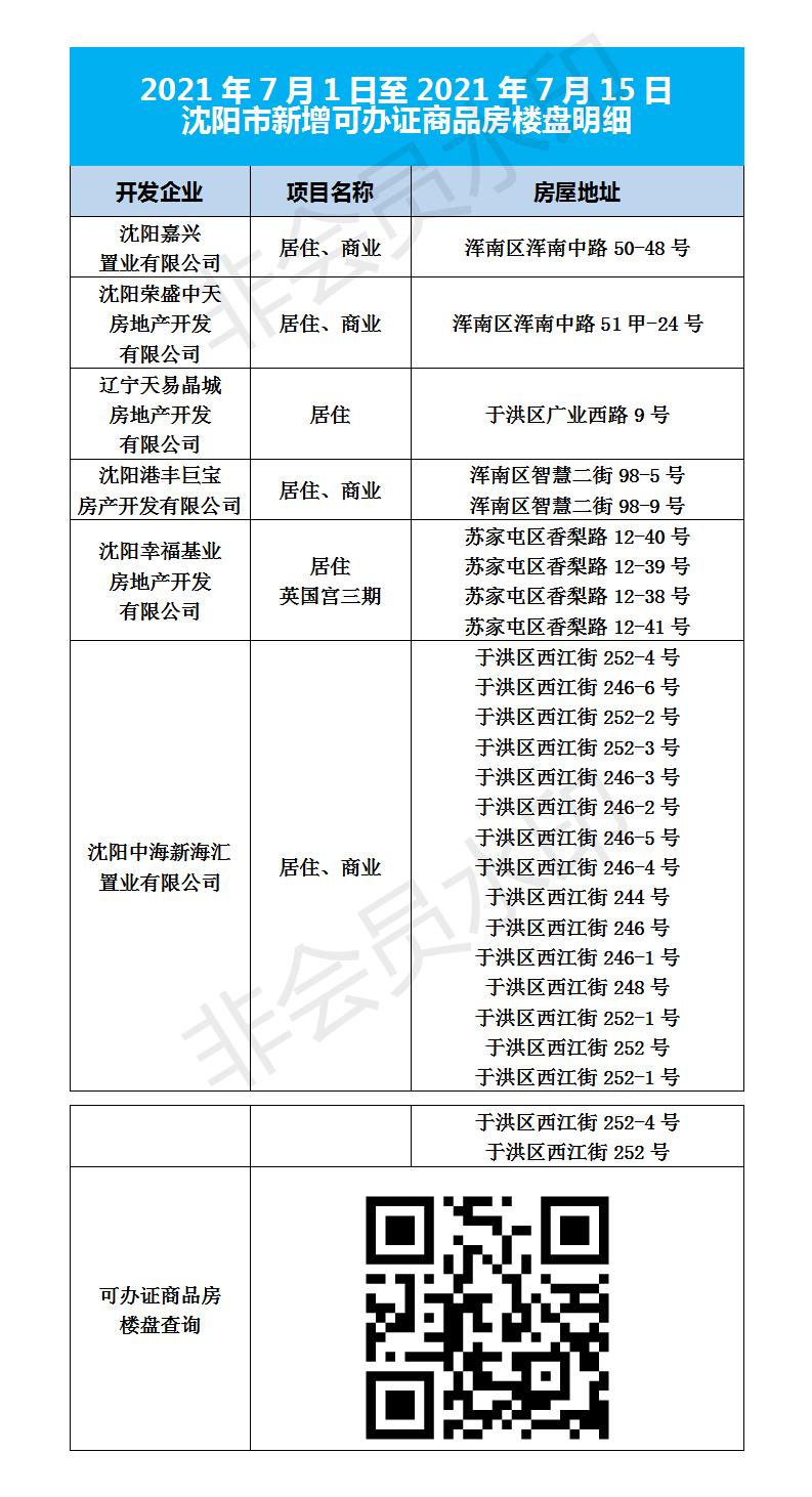 2021年7月1日至7月15日 沈城新增可办证商品房楼盘