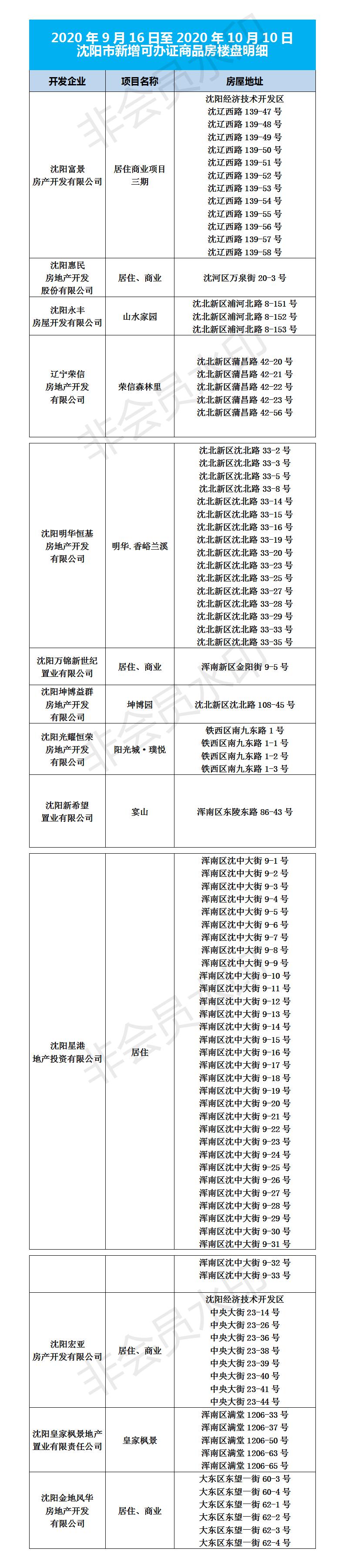 2020年9月16日至10月10日 沈城新增可办证商品房楼盘