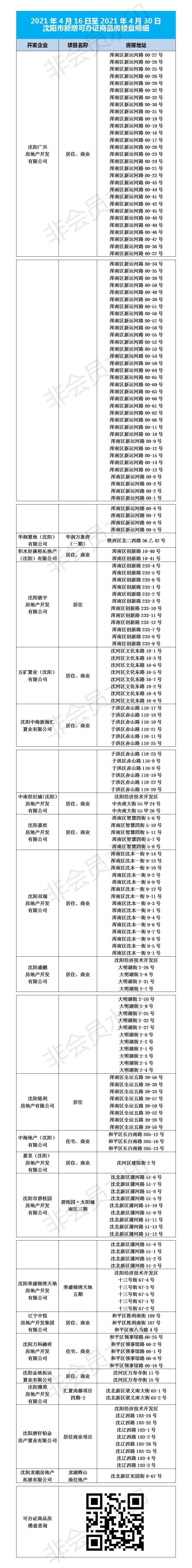 2021年4月16日至4月30日 沈城新增可办证商品房楼盘