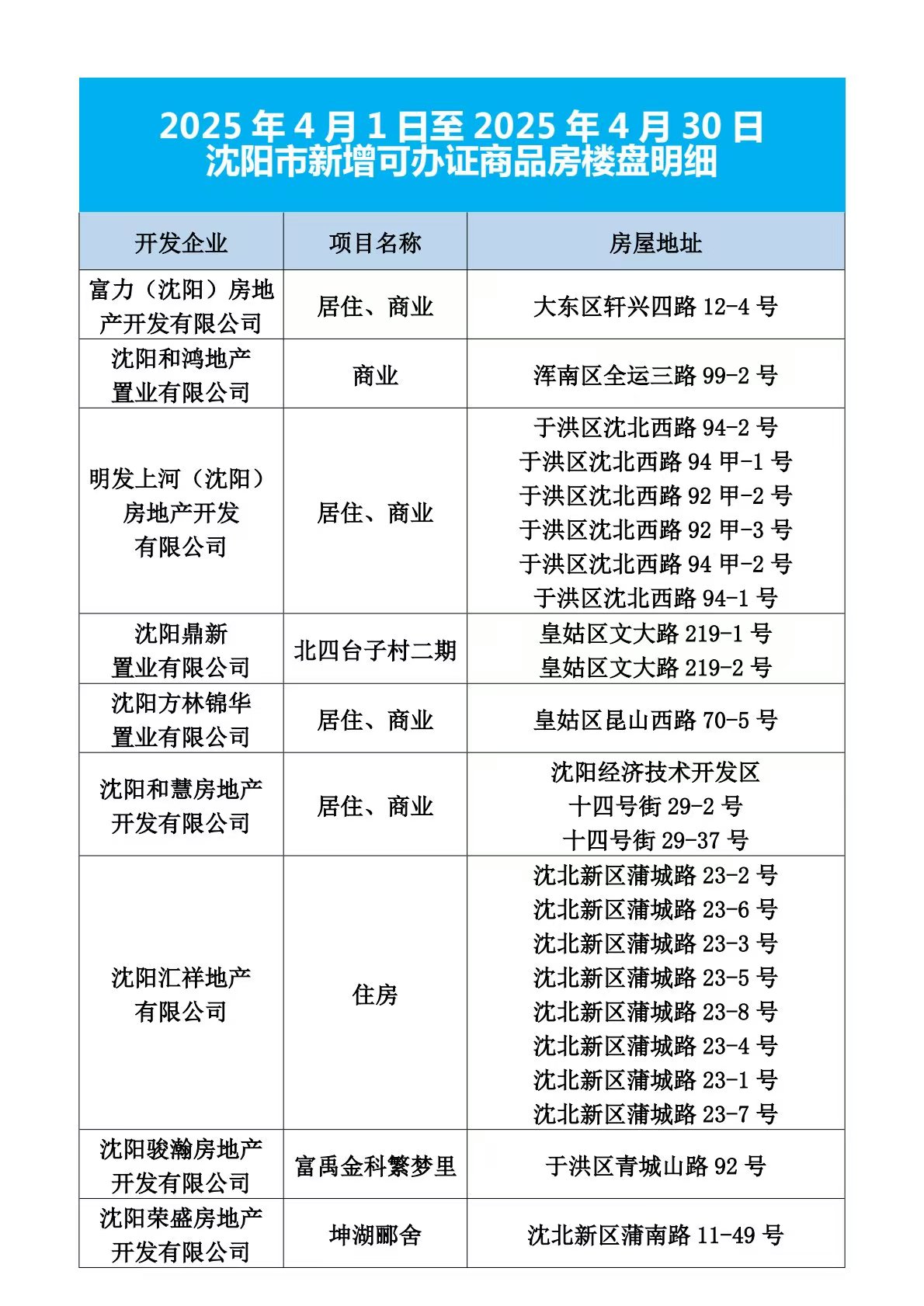 2025年4月1日至4月30日 沈城新增可办证商品房楼盘