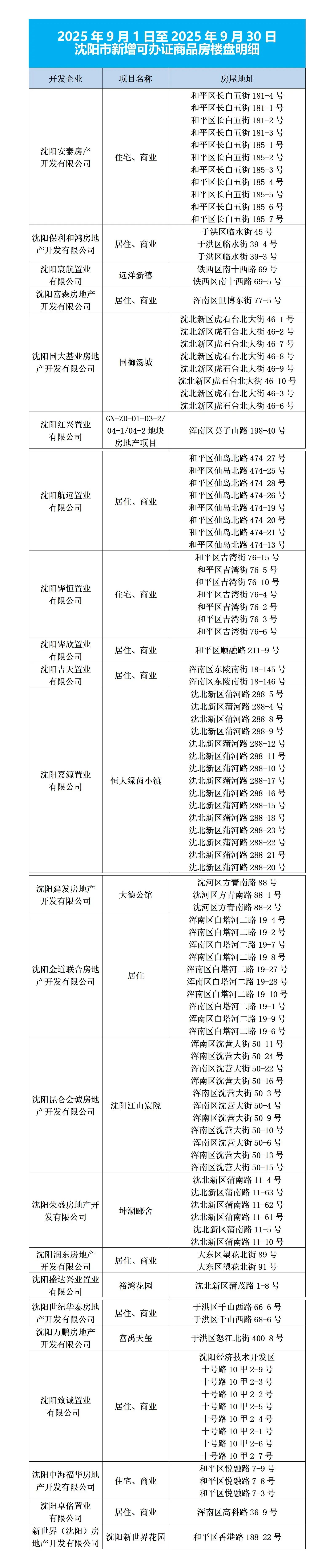 2025年8月1日至10月31日 沈城新增可办证商品房楼盘