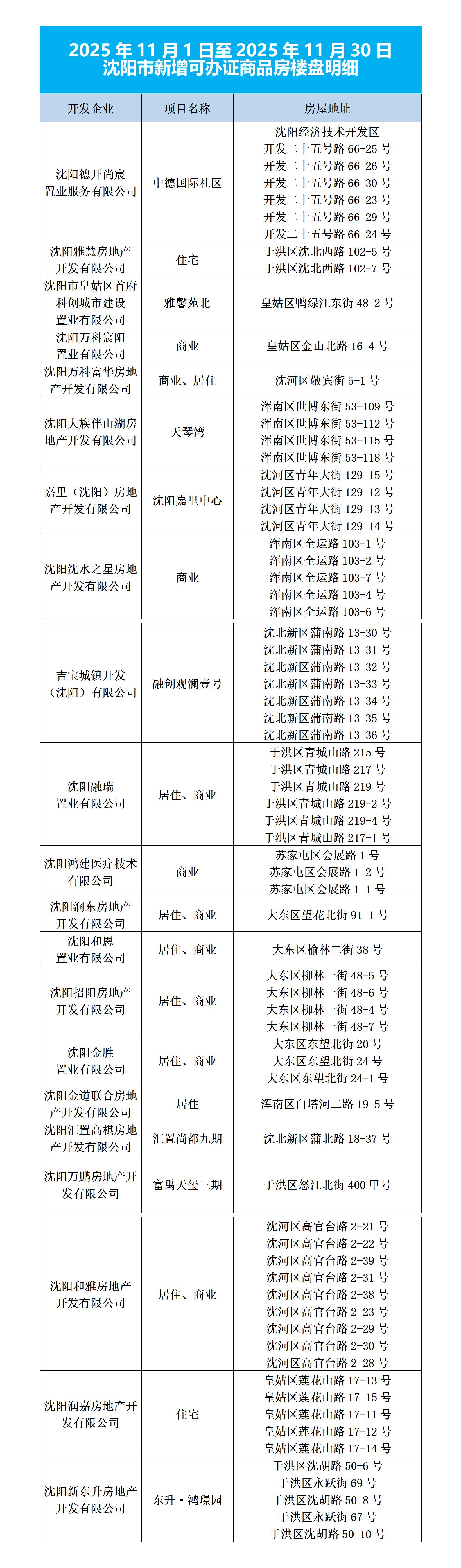2025年11月1日至11月30日 沈城新增可办证商品房楼盘