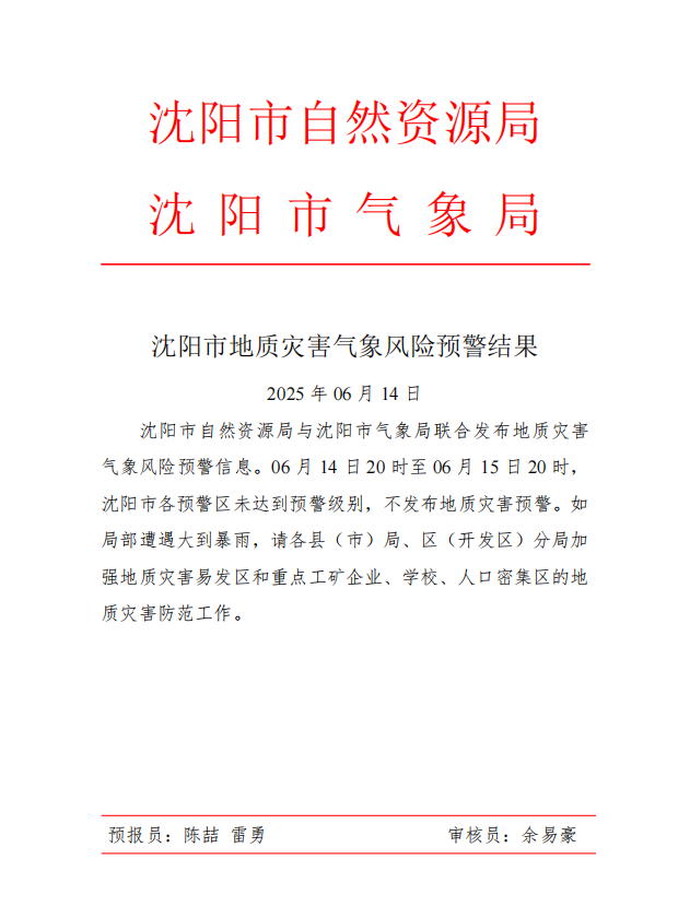 沈阳市地质灾害气象风险预警结果(6月14日)