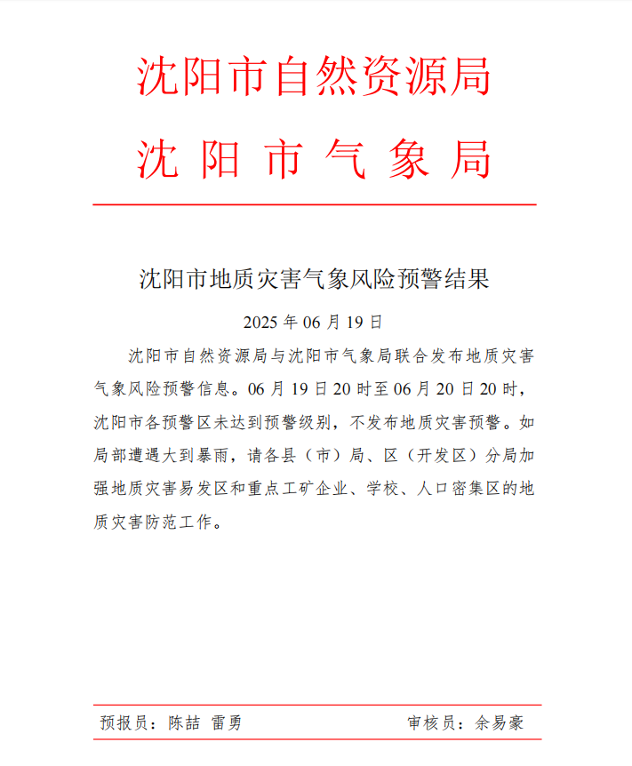 沈阳市地质灾害气象风险预警结果(6月19日)