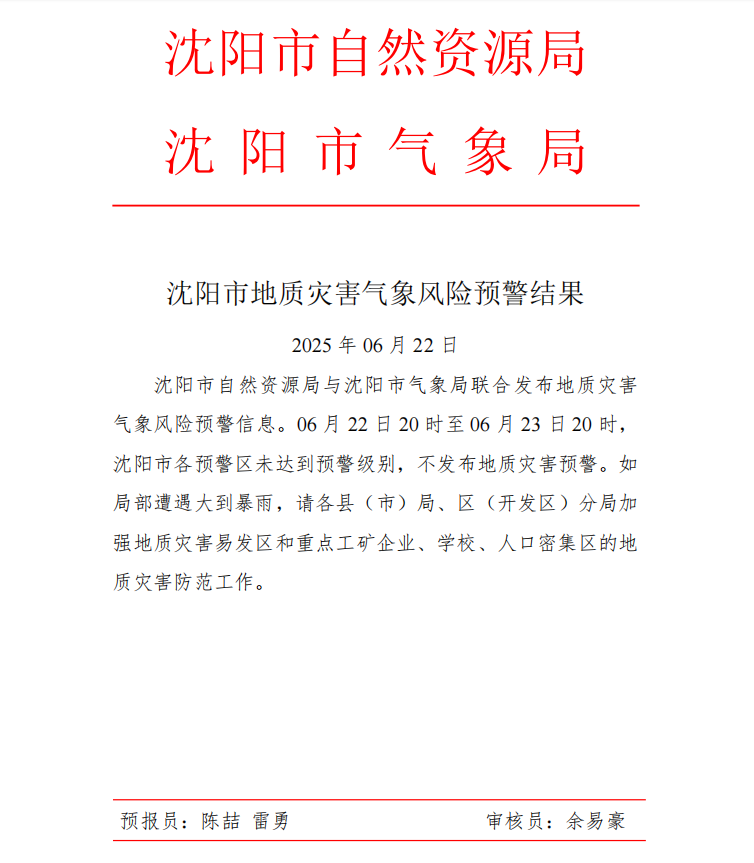 沈阳市地质灾害气象风险预警结果(6月22日)