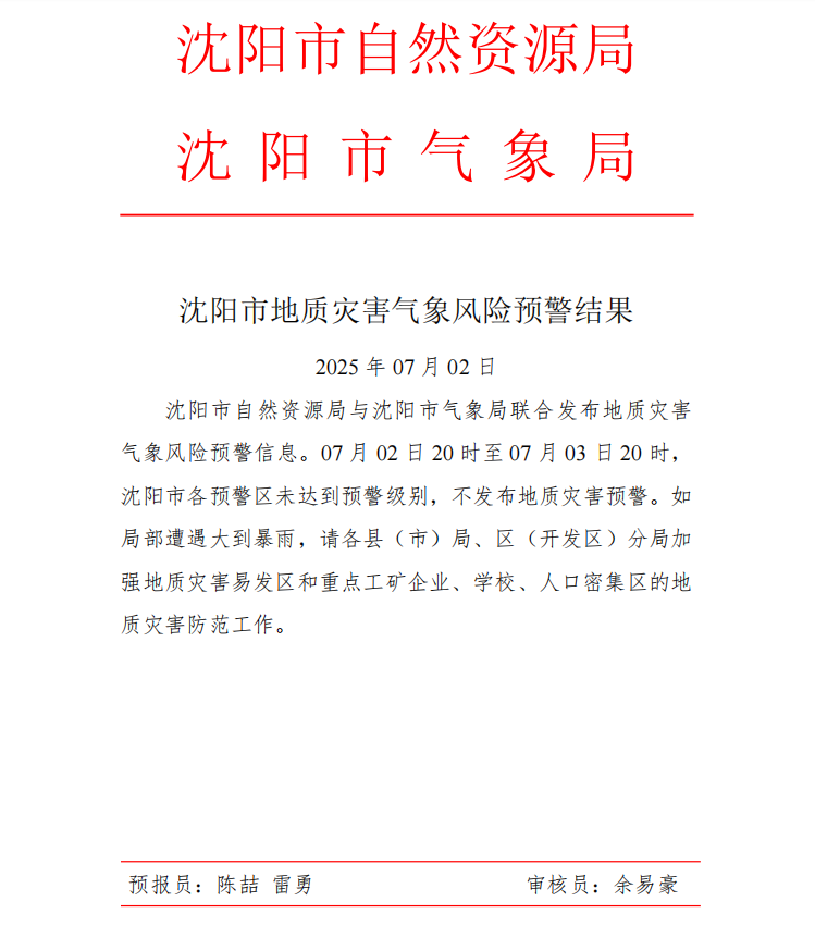 沈阳市地质灾害气象风险预警结果(7月2日)