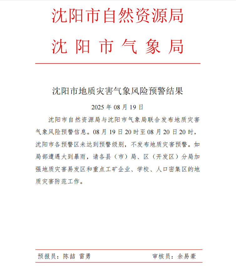 沈阳市地质灾害气象风险预警结果(8月19日)