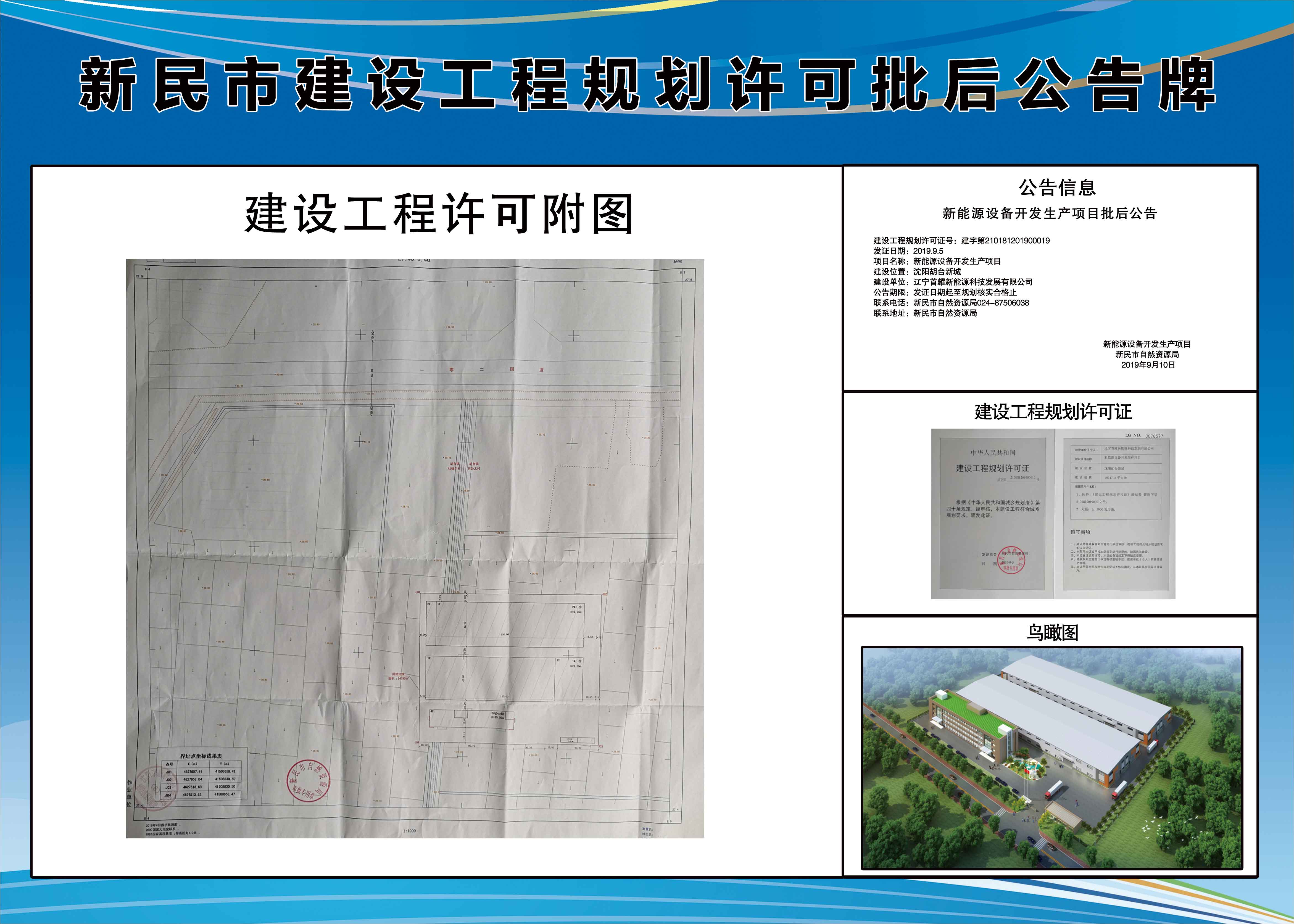 公告信息 新能源设备开发生产项目批后公告 建设工程规划许可证号:建字第210181201900019 发证日期:2019.9.5 项目名称:新能源设备开发生产项目 建设位置:沈阳胡台新城 建设单位:辽宁首耀新能源科技发展有限公司 公告期限:发证日期起至规划核实合格止 联系电话:新民市自然资源局024-87506038 联系地址:新民市自然资源局