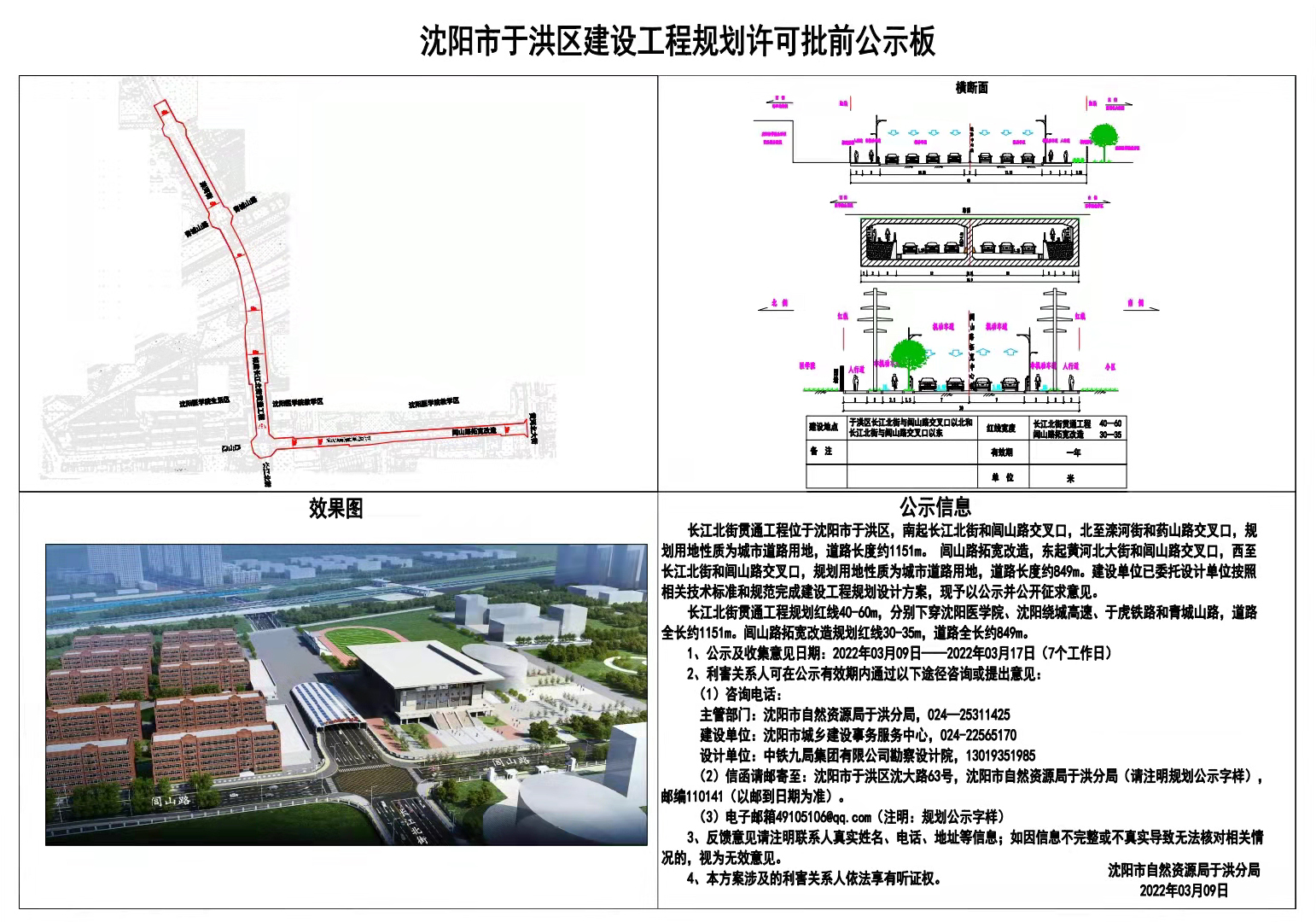 长江北街贯通工程工程规划许可证批前公示长江北街贯通工程位于沈阳市于洪区,南起长江北街和闾山路交叉口,北至滦河街和药山路交叉口,规划用地性质为城市道路用地,道路长度约1151m。 闾山路拓宽改造,东起黄河北大街和闾山路交叉口,西至长江北街和闾山路交叉口,规划用地性质为城市道路用地,道路长度约849m。建设单位已委托设计单位按照相关技术标准和规范完成建设工程规划设计方案,现予以公示并公开征求意见。 长江北街贯通工程规划红线40-60m,分别下穿沈阳医学院、沈阳绕城高速、于虎铁路和青城山路,道路全长约1151m。闾山路拓宽改造规划红线30-35m,道路全长约849m。 1、公示及收集意见日期:2022年03月09日——2022年03月17日(7个工作日) 2、利害关系人可在公示有效期内通过以下途径咨询或提出意见: (1)咨询电话: 主管部门:沈阳市自然资源局于洪分局,024—25311425 建设单位:沈阳市城乡建设事务服务中心,024-22565170 设计单位:中铁九局集团有限公司勘察设计院,13019351985 (2)信函请邮寄至:沈阳市于洪区沈大路63号,沈阳市自然资源局于洪分局(请注明规划公示字样),邮编110141(以邮到日期为准)。 (3)电子邮箱49105106@qq.com(注明:规划公示字样) 3、反馈意见请注明联系人真实姓名、电话、地址等信息;如因信息不完整或不真实导致无法核对相关情况的,视为无效意见。 4、本方案涉及的利害关系人依法享有听证权。