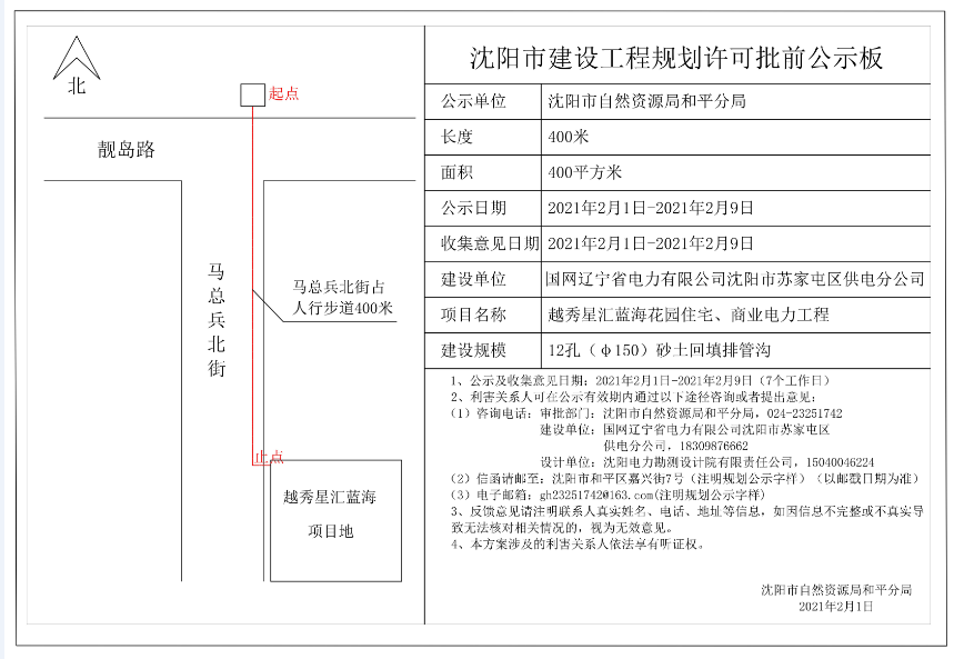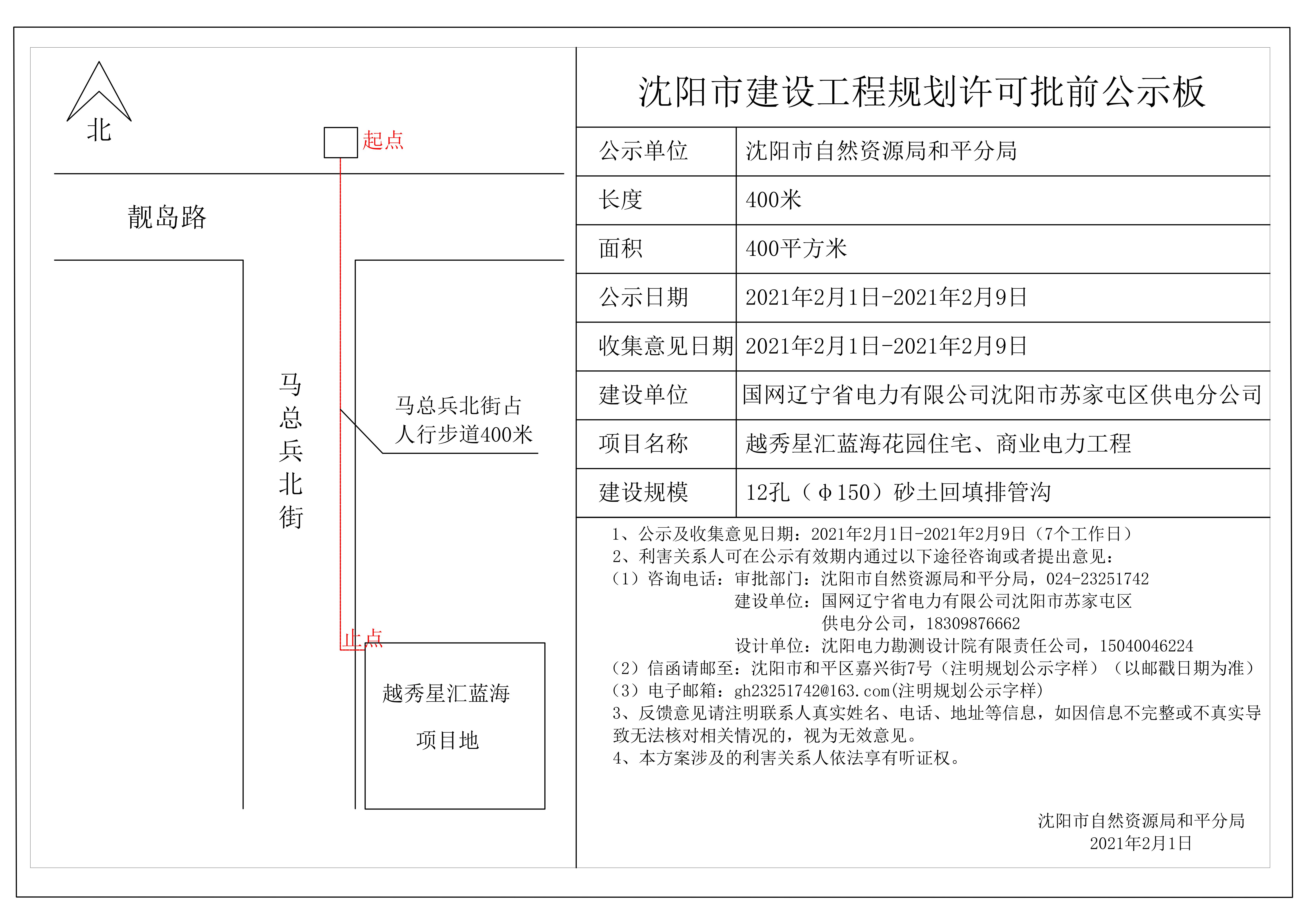 国网辽宁省电力有限公司沈阳市苏家屯区供电分公司越秀星汇蓝海花园住宅商业电力工程建设工程规划许可证(市政)批前公示