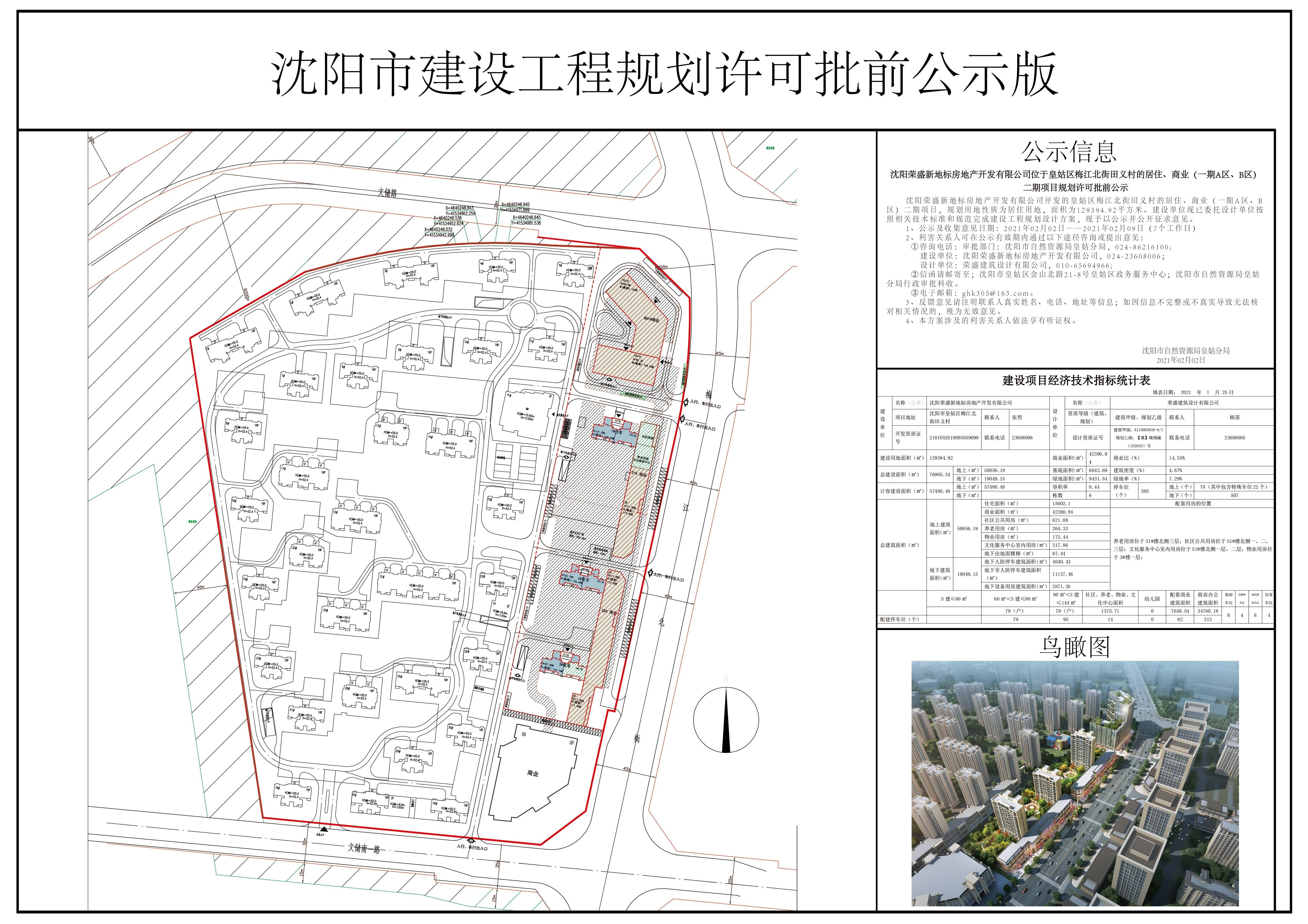 沈阳荣盛新地标房地产开发有限公司开发的皇姑区梅江北街田义村的居住、商业(一期A区、B区)二期项目,规划用地性质为居住用地,面积为129394.92平方米。建设单位现已委托设计单位按照相关技术标准和规范完成建设工程规划设计方案,现予以公示并公开征求意见。 1、公示及收集意见日期:2021年02月02日——2021年02月09日(7个工作日) 2、利害关系人可在公示有效期内通过以下途径咨询或提出意见: ①咨询电话:审批部门:沈阳市自然资源局皇姑分局,024-86216100; 建设单位:沈阳荣盛新地标房地产开发有限公司,024-23608006; 设计单位:荣盛建筑设计有限公司,010-65694966; ②信函请邮寄至;沈阳市皇姑区金山北路21-8号皇姑区政务服务中心;沈阳市自然资源局皇姑分局行政审批科收。 ③电子邮箱:ghk305@163.com。 3、反馈意见请注明联系人真实姓名、电话、地址等信息;如因信息不完整或不真实导致无法核对相关情况的,视为无效意见。 4、本方案涉及的利害关系人依法享有听证权。