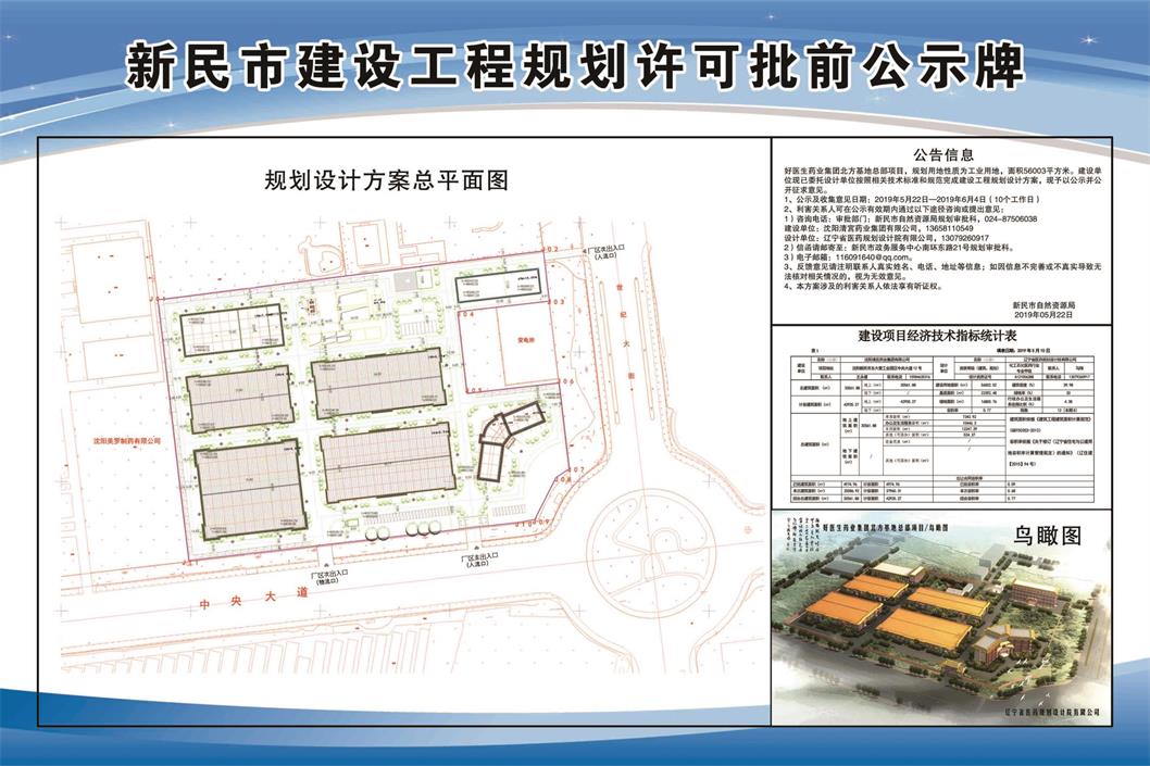 好医生药业集团北方基地总部项目,规划用地性质为工业用地,面积56003平方米。建设单位现已委托设计单位按照相关技术标准和规范完成建设工程规划设计方案,现予以公示并公开征求意见。 1.公示及收集意见日期:2019年05月 22 日—2019年06月04 日(10个工作日) 2.利害关系人可在公示有效期内通过以下途径咨询或提出意见: 1)咨询电话:审批部门:新民市自然资源局规划审批科,024-87506038 建设单位:沈阳清宫药业集团有限公司,13658110549 设计单位:辽宁省医药规划设计院有限公司,13079260917 2)信函请邮寄至:新民市政务服务中心南环东路21号规划审批科。 3)电子邮箱:116091640@qq.com。 3.反馈意见请注明联系人真实姓名、电话、地址等信息;如因信息不完善或不真实导致无法核对相关情况的,视为无效意见。 4.本方案涉及的利害关系人依法享有听证权。