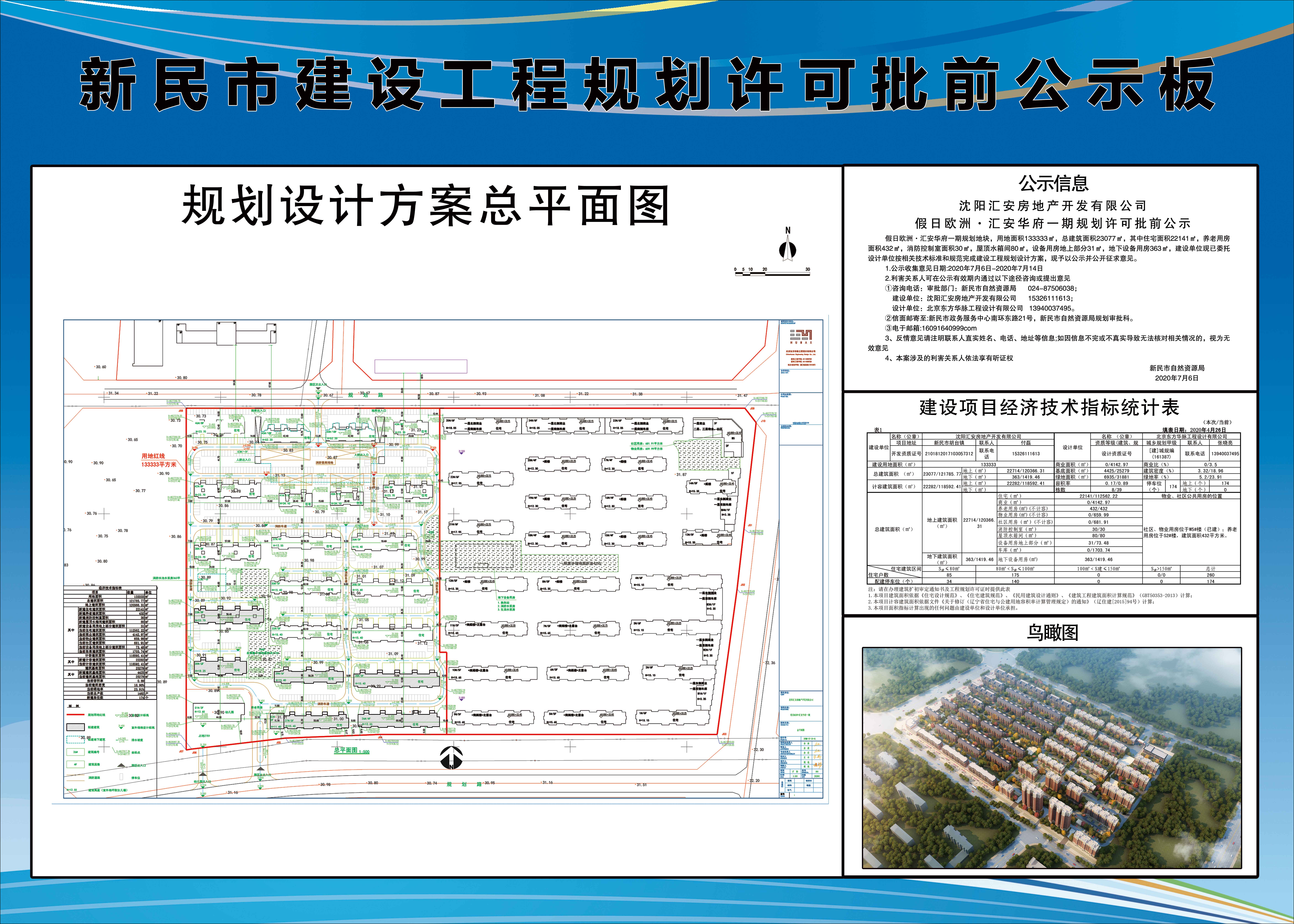 沈阳汇安房地产开发有限公司假日欧洲·汇安华府一期规划许可批前公示 假日欧洲·汇安华府一期规划地块,用地面积133333㎡,总建筑面积23077㎡,其中住宅面积22141㎡,养老用房面积432㎡,消防控制室面积30㎡,屋顶水箱间80㎡,设备用房地上部分31㎡,地下设备用房363㎡,建设单位现已委托设计单位按相关技术标准和规范完成建设工程规划设计方案,现予以公示并公开征求意见。 1.公示收集意见日期:2020年7月6日-2020年7月14日 2.利害关系人可在公示有效期内通过以下途径咨询或提出意见 ①咨询电话:审批部门:新民市自然资源局 024-87506038; 建设单位:沈阳汇安房地产开发有限公司 15326111613; 设计单位:北京东方华脉工程设计有限公司 13940037495。 ②信面邮寄至:新民市政务服务中心南环东路21号,新民市自然资源局规划审批科。 ③电于邮箱:16091640999com 3、反情意见请注明联系人真实姓名、电话、地址等信息;如因信息不完或不真实导致无法核对相关情况的,视为无效意见 4、本案涉及的利害关系人依法享有听证权 2020年7月6日