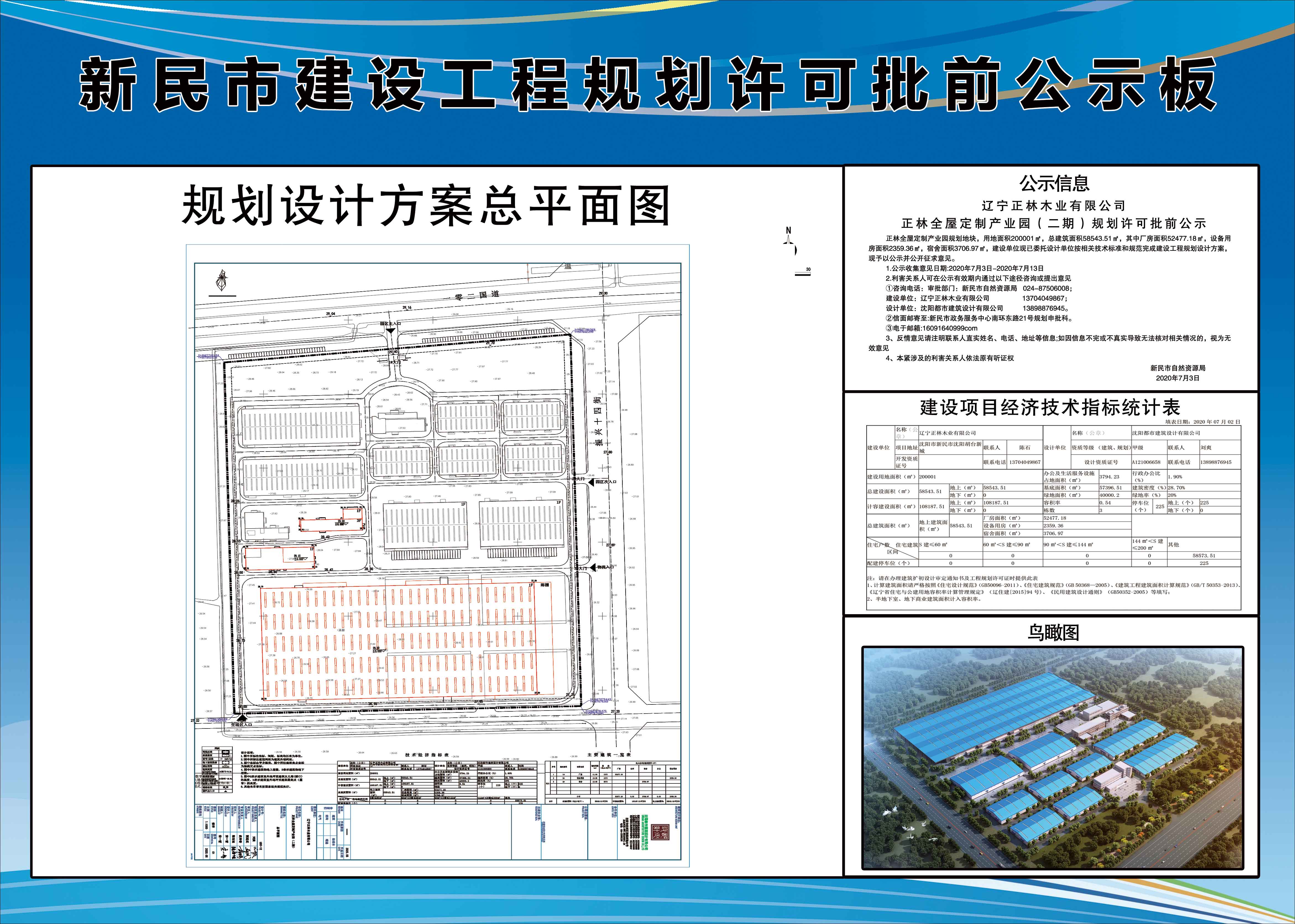 辽宁正林木业有限公司 正林全屋定制产业园(二期)规划许可批前公示 正林全屋定制产业园规划地块,用地面积200001㎡,总建筑面积58543.51㎡,其中厂房面积52477.18㎡,设备用房面积2359.36㎡,宿舍面积3706.97㎡,建设单位现已委托设计单位按相关技术标准和规范完成建设工程规划设计方案,现予以公示并公开征求意见。 1.公示收集意见日期:2020年7月3日-2020年7月13日 2.利害关系人可在公示有效期内通过以下途径咨询或提出意见 ①咨询电话:审批部门:新民市自然资源局 024-87506038 ; 建设单位:辽宁正林木业有限公司 13704049867; 设计单位:沈阳都市建筑设计有限公司 13898876945。 ②信面邮寄至:新民市政务服务中心南环东路21号,新民市自然资源局规划审批科。 ③电子邮箱:116091640@qq.com 3、反馈意见请注明联系人真实姓名、电话、地址等信息;如因信息不完全或不真实导致无法核对相关情况的,视为无效意见 4、本案涉及的利害关系人依法享有听证权 新民市自然资源局 2020年7月3日