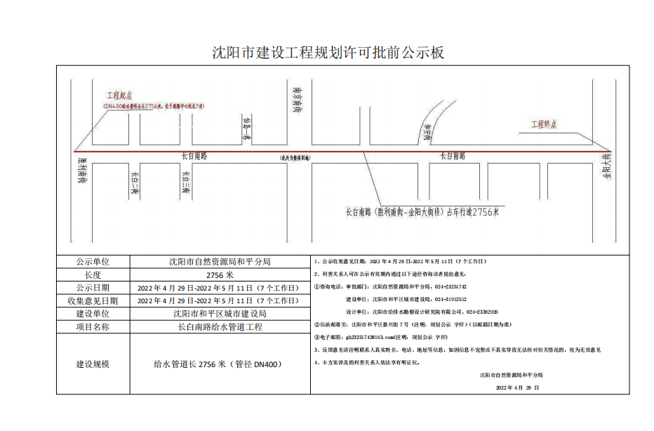 沈阳市和平区城市建设局长白地区供水改造工程-长白南路给水工程市政工程规划许可证批前公示
