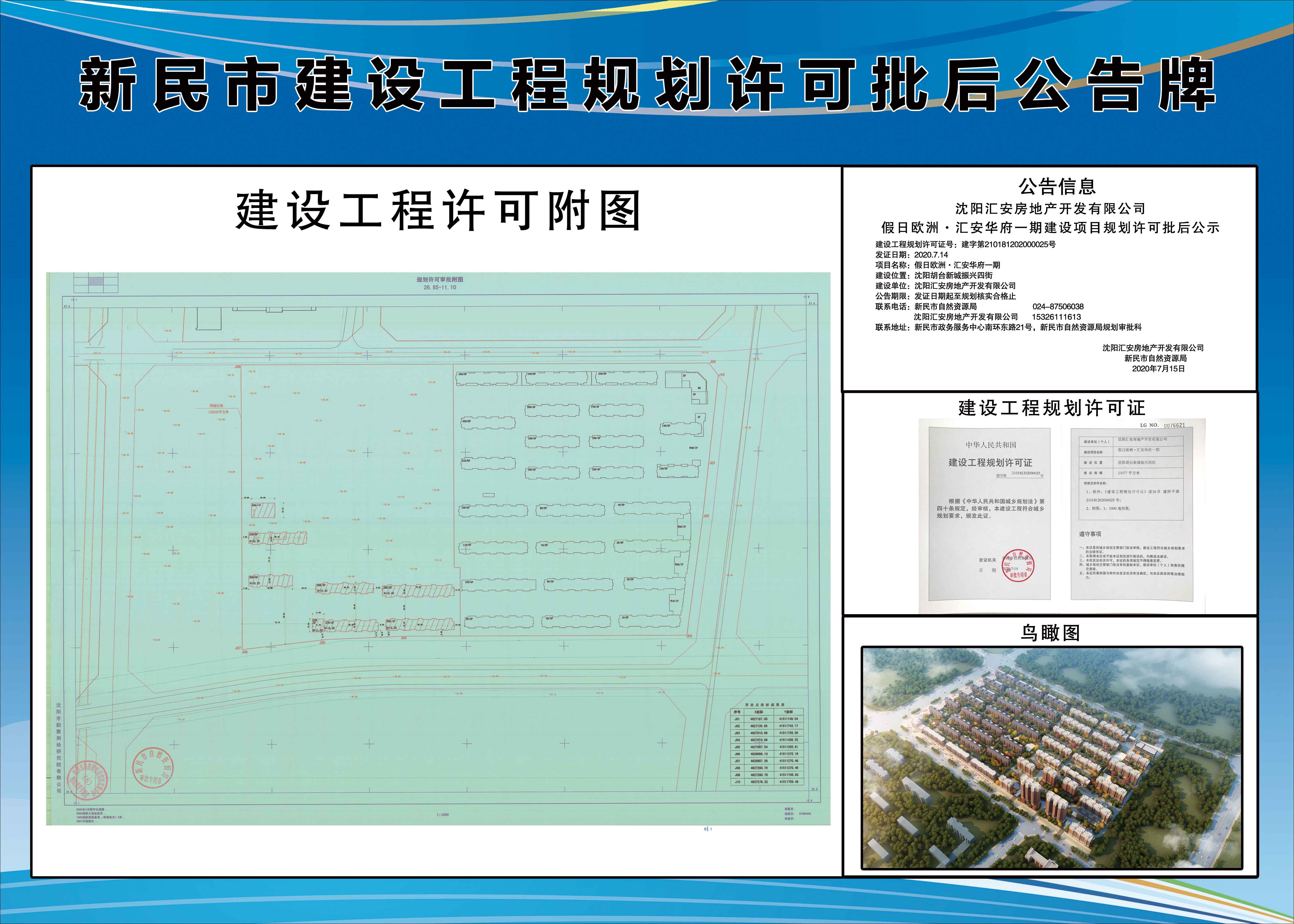 沈阳汇安房地产开发有限公司 假日欧洲·汇安华府一期建设项目规划许可批后公示 建设工程规划许可证号:建字第210181202000025号 发证日期:2020.7.14 项目名称:假日欧洲·汇安华府一期 建设位置:沈阳胡台新城振兴四街 建设单位:沈阳汇安房地产开发有限公司 公告期限:发证日期起至规划核实合格止 联系电话:新民市自然资源局 024-87506038 沈阳汇安房地产开发有限公司 15326111613 联系地址:新民市政务服务中心南环东路21号,新民市自然资源局规划审批科