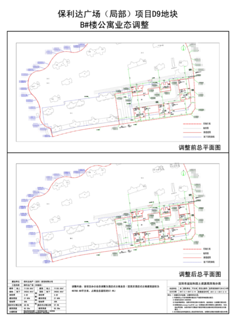 根据《沈阳市人民政府办公厅关于促进房地产市场健康发展的实施意见(试行)》、《沈阳市人民政府办公厅关于印发沈阳市促进房地产市场健康发展的补充措施的通知》等文件精神,经建设单位申请、专业审核,在该项目容积率、建筑密度等规划条件不变的前提下,拟将该项目B#建筑用途由办公业态调整为酒店式公寓业态(变更后酒店式公寓建筑面积为40780.68平方米,占商业总面积的57.4%)。特此公告。拟变更的相关情况请登录沈阳市规划和国土资源局网站(zrzyj.shenyang.gov.cn)或关注现场公示。