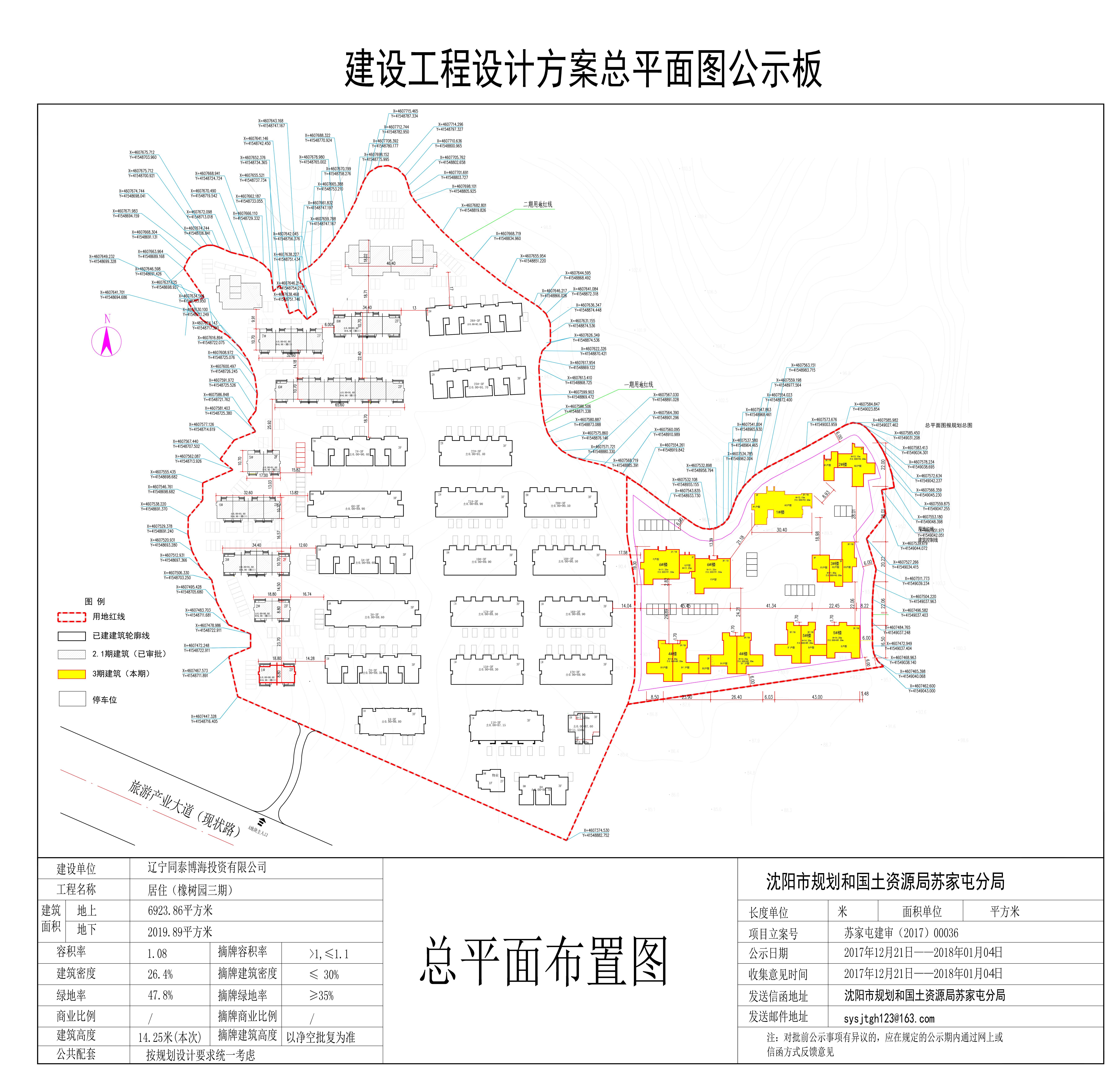 经沈阳市规划和国土资源局苏家屯分局规划科审核,拟批准辽宁同泰博海投资有限公司位于苏家屯区姚千街道旅游产业大道北的居住(橡树园三期)建设项目总平面规划方案,现对该项目总平面规划方案进行公示