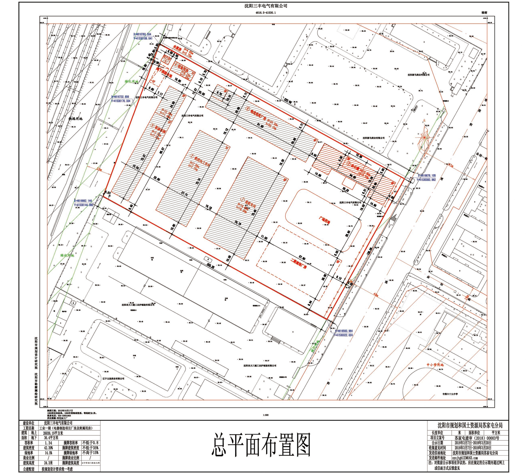 沈阳三丰电气有限公司工业一期建设项目总平面规划方案批前公示