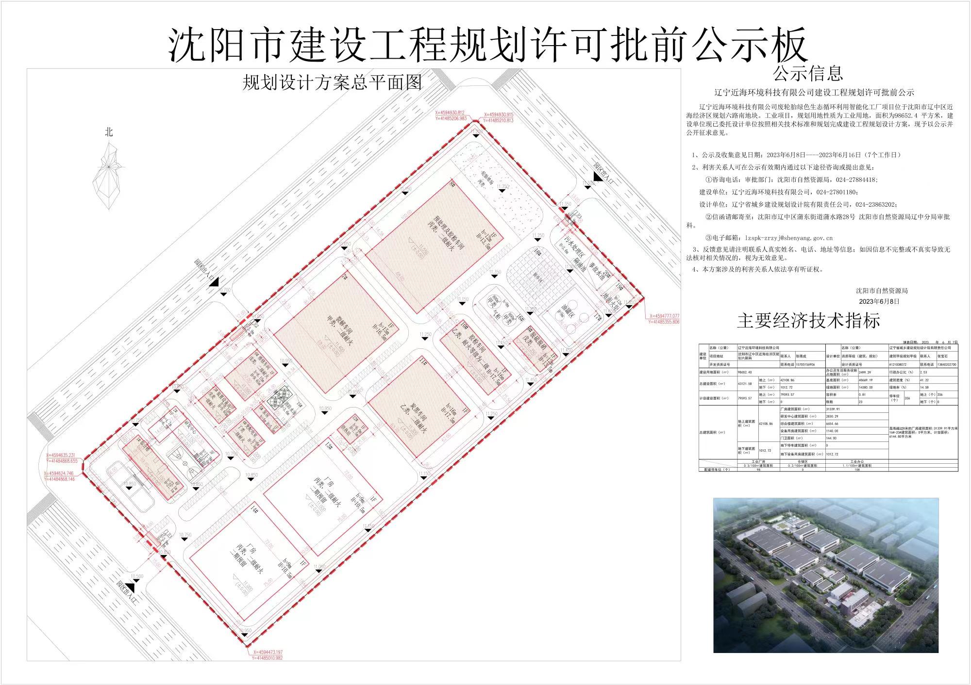辽宁近海环境科技有限公司建设工程规划许可批前公示 辽宁近海环境科技有限公司废轮胎绿色生态循环利用智能化工厂项目位于沈阳市辽中区近海经济区规划六路南地块。工业项目,规划用地性质为工业用地,面积为98652.4平方米,建设单位现已委托设计单位按照相关技术标准和规划完成建设工程规划设计方案,现予以公示并公开征求意见。 1、公示及收集意见日期:2023年6月8日——2023年6月16日(7个工作日) 2、利害关系人可在公示有效期内通过以下途径咨询或提出意见: ①咨询电话:审批部门:沈阳市自然资源局,024-27884418; 建设单位:辽宁近海环境科技有限公司,024-27801180; 设计单位:辽宁省城乡建设规划设计院有限责任公司,024-23863202; ②信函请邮寄至:沈阳市辽中区蒲东街道蒲水路28号 沈阳市自然资源局辽中分局审批科。 ③电子邮箱:lzspk-zrzyj@shenyang.gov.cn 3、反馈意见请注明联系人真实姓名、电话、地址等信息;如因信息不完整或不真实导致无法核对相关情况的,视为无效意见。 4、本方案涉及的利害关系人依法享有听证权。 沈阳市自然资源局 2023年6月8日