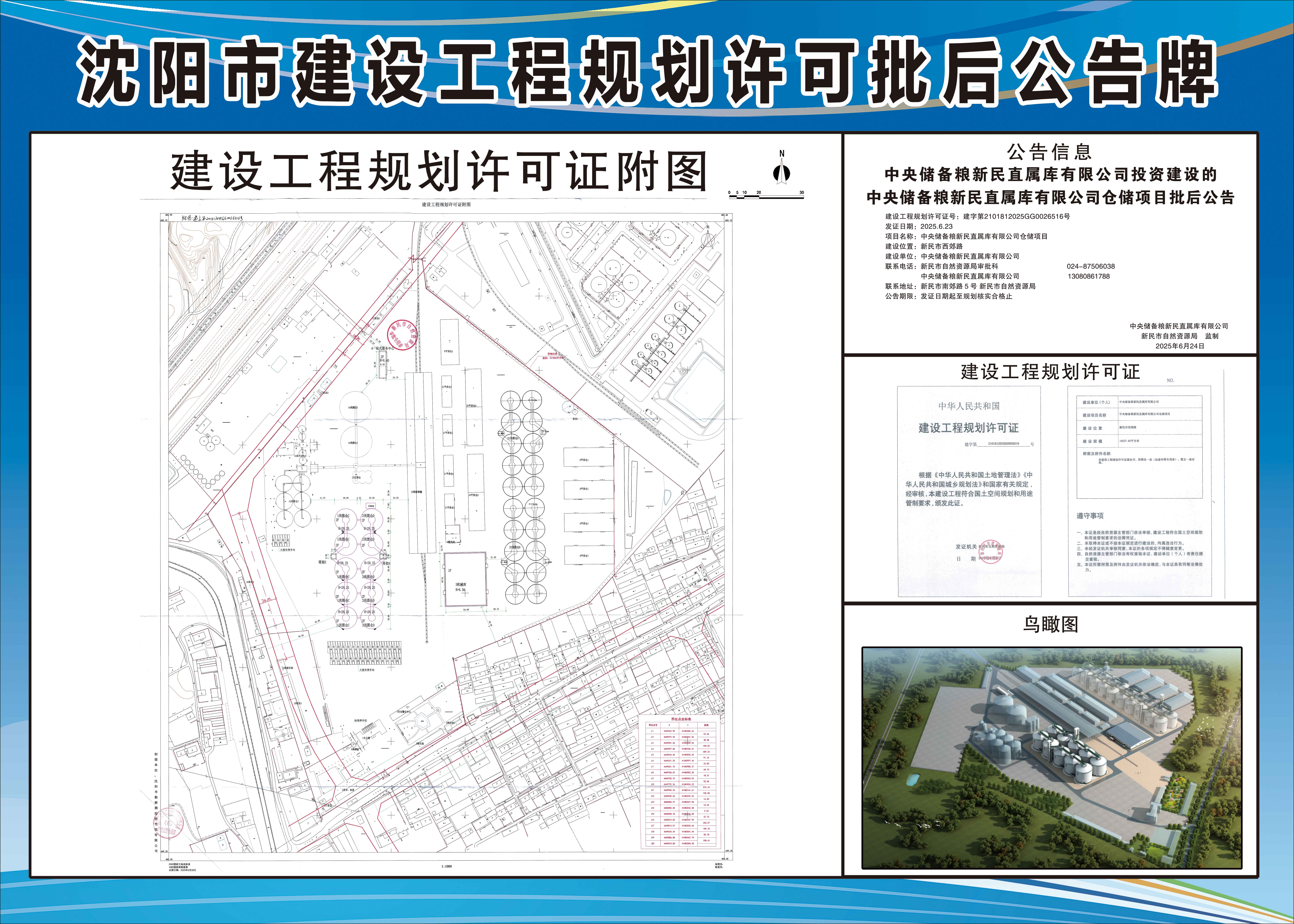 建设工程规划许可证号:建字第2101812025GG0026516号 发证日期:2025.6.23 项目名称:中央储备粮新民直属库有限公司仓储项目 建设位置:新民市西郊路 建设单位:中央储备粮新民直属库有限公司 联系电话:新民市自然资源局审批科,024-87506038 中央储备粮新民直属库有限公司,13080861788 联系地址:新民市南郊路5号,新民市自然资源局 公告期限:发证日期起至规划核实合格止 中央储备粮新民直属库有限公司 新民市自然资源局 监制 2025年6月24日