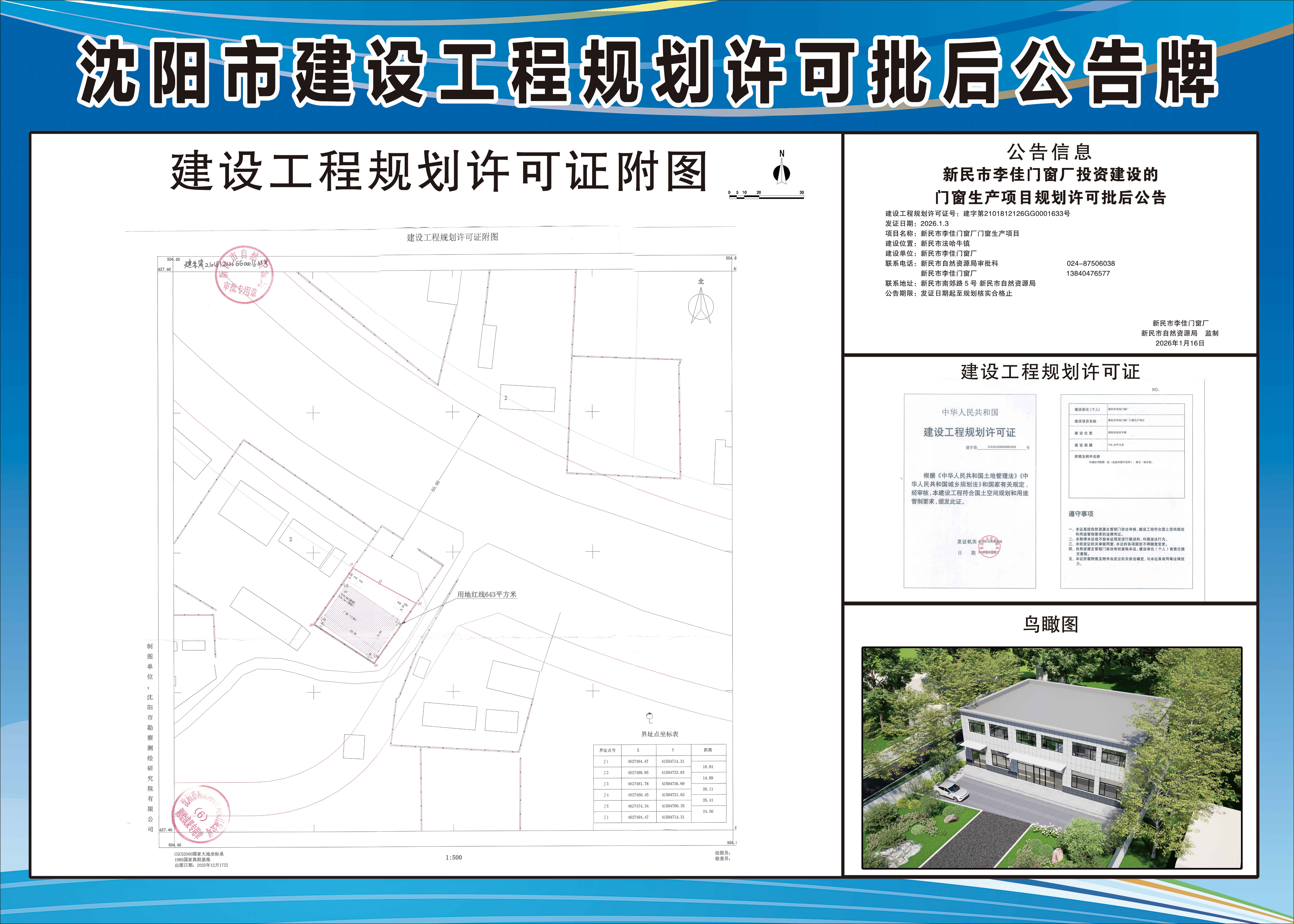 建设工程规划许可证号:建字第2101812126GG0001633号 发证日期:2026.1.3 项目名称:新民市李佳门窗厂门窗生产项目 建设位置:新民市法哈牛镇 建设单位:新民市李佳门窗厂 联系电话:新民市自然资源局审批科 024-87506038 新民市李佳门窗厂 13840476577 联系地址:新民市南郊路5号 新民市自然资源局 公告期限:发证日期起至规划核实合格止 新民市李佳门窗厂 新民市自然资源局 监制 2026年1月16日