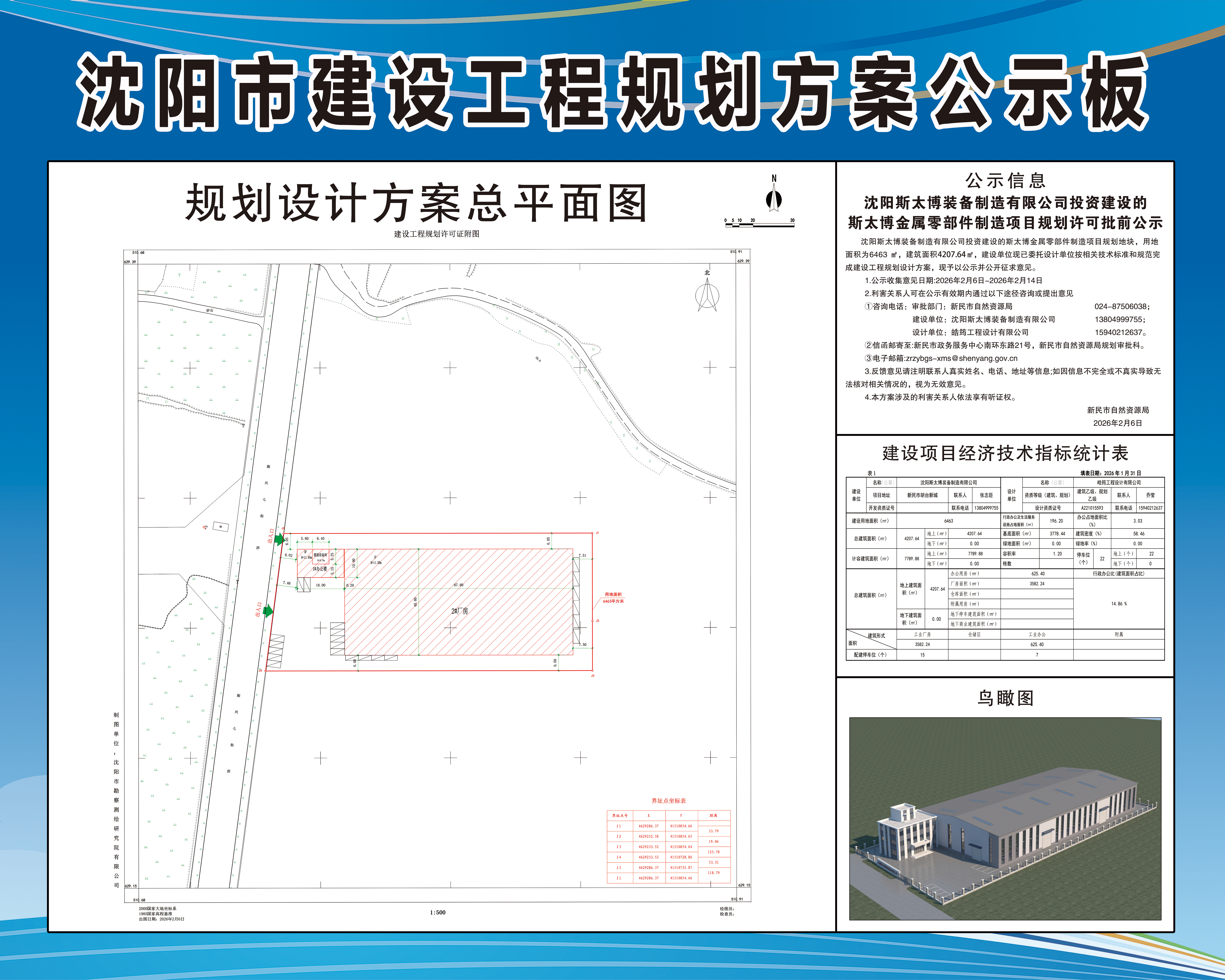 沈阳斯太博装备制造有限公司投资建设的斯太博金属零部件制造项目规划地块,用地面积为6463 ㎡,建筑面积4207.64㎡,建设单位现已委托设计单位按相关技术标准和规范完成建设工程规划设计方案,现予以公示并公开征求意见。 1.公示收集意见日期:2026年2月6日-2026年2月14日 2.利害关系人可在公示有效期内通过以下途径咨询或提出意见 ①咨询电话: 审批部门:新民市自然资源局,024-87506038; 建设单位:沈阳斯太博装备制造有限公司,13804999755; 设计单位:皓筠工程设计有限公司,15940212637。 ②信函邮寄至:新民市政务服务中心南环东路21号,新民市自然资源局规划审批科。 ③电子邮箱:zrzybgs-xms@shenyang.gov.cn 3.反馈意见请注明联系人真实姓名、电话、地址等信息;如因信息不完全或不真实导致无法核对相关情况的,视为无效意见。 4.本方案涉及的利害关系人依法享有听证权。 新民市自然资源局 2026年2月6日