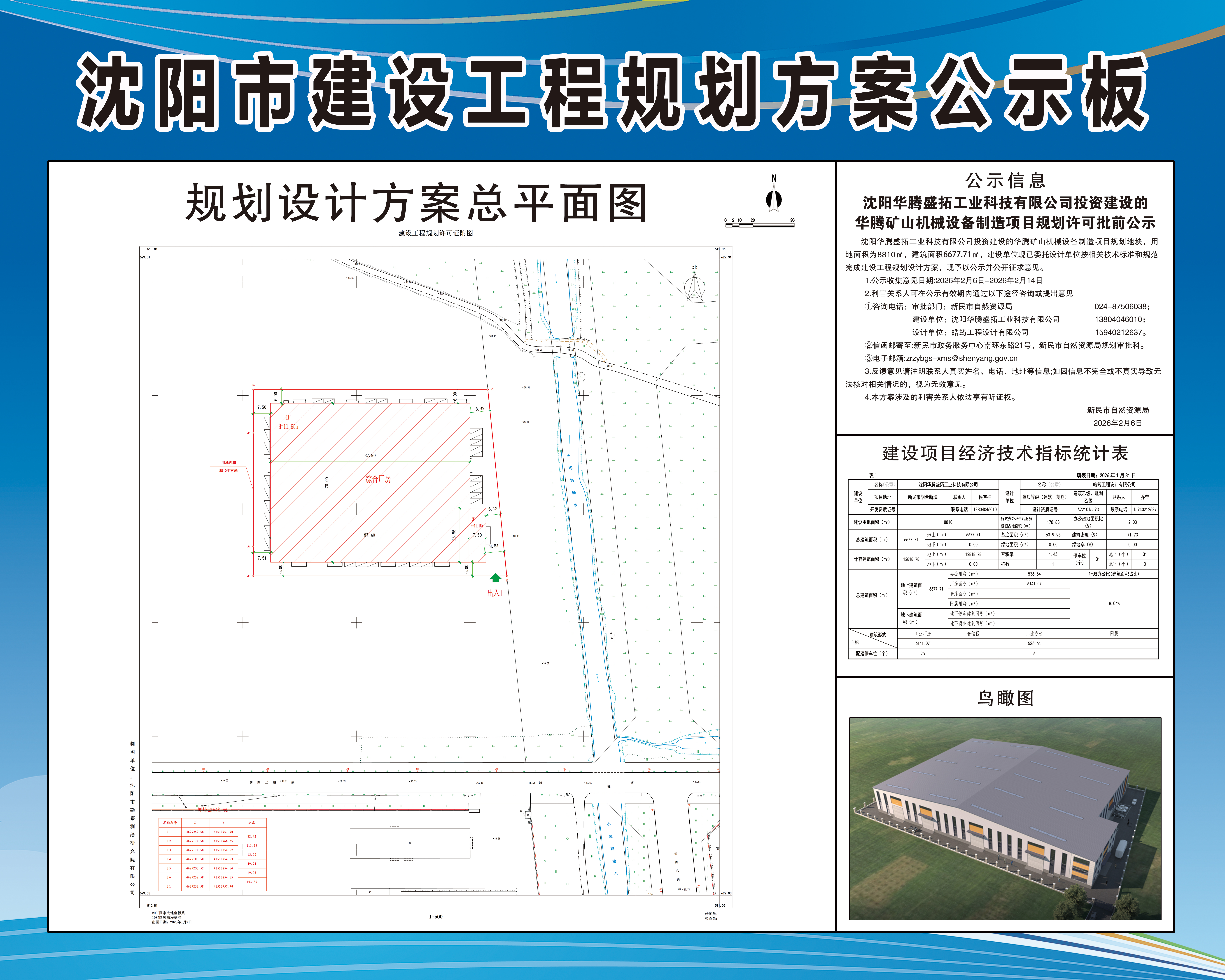 沈阳华腾盛拓工业科技有限公司投资建设的华腾矿山机械设备制造项目规划地块,用地面积为8810㎡,建筑面积6677.71㎡,建设单位现已委托设计单位按相关技术标准和规范完成建设工程规划设计方案,现予以公示并公开征求意见。 1.公示收集意见日期:2026年2月6日-2026年2月14日 2.利害关系人可在公示有效期内通过以下途径咨询或提出意见 ①咨询电话: 审批部门:新民市自然资源局,024-87506038; 建设单位:沈阳华腾盛拓工业科技有限公司,13804046010; 设计单位:皓筠工程设计有限公司,15940212637。 ②信函邮寄至:新民市政务服务中心南环东路21号,新民市自然资源局规划审批科。 ③电子邮箱:zrzybgs-xms@shenyang.gov.cn 3.反馈意见请注明联系人真实姓名、电话、地址等信息;如因信息不完全或不真实导致无法核对相关情况的,视为无效意见。 4.本方案涉及的利害关系人依法享有听证权。 新民市自然资源局 2026年2月6日