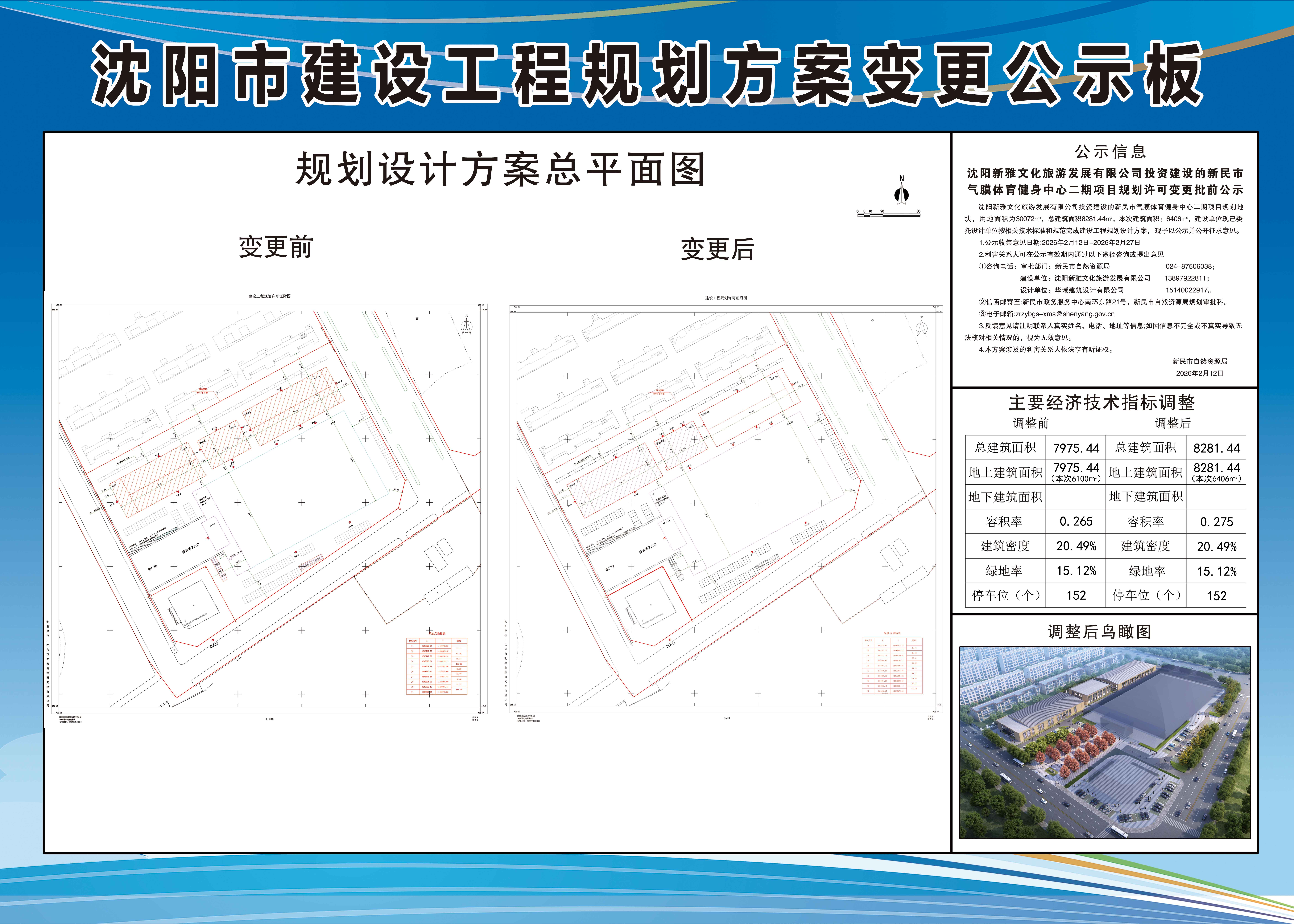沈阳新雅文化旅游发展有限公司投资建设的新民市气膜体育健身中心二期项目规划地块,用地面积为30072㎡,总建筑面积8281.44㎡,本次建筑面积:6406㎡,建设单位现已委托设计单位按相关技术标准和规范完成建设工程规划设计方案,现予以公示并公开征求意见。 1.公示收集意见日期:2026年2月12日-2026年2月27日 2.利害关系人可在公示有效期内通过以下途径咨询或提出意见 ①咨询电话: 审批部门:新民市自然资源局, 024-87506038; 建设单位:沈阳新雅文化旅游发展有限公司,13897922811; 设计单位:华域建筑设计有限公司,15140022917。 ②信函邮寄至:新民市政务服务中心南环东路21号,新民市自然资源局规划审批科。 ③电子邮箱:zrzybgs-xms@shenyang.gov.cn 3.反馈意见请注明联系人真实姓名、电话、地址等信息;如因信息不完全或不真实导致无法核对相关情况的,视为无效意见。 4.本方案涉及的利害关系人依法享有听证权。 新民市自然资源局 2026年2月12日