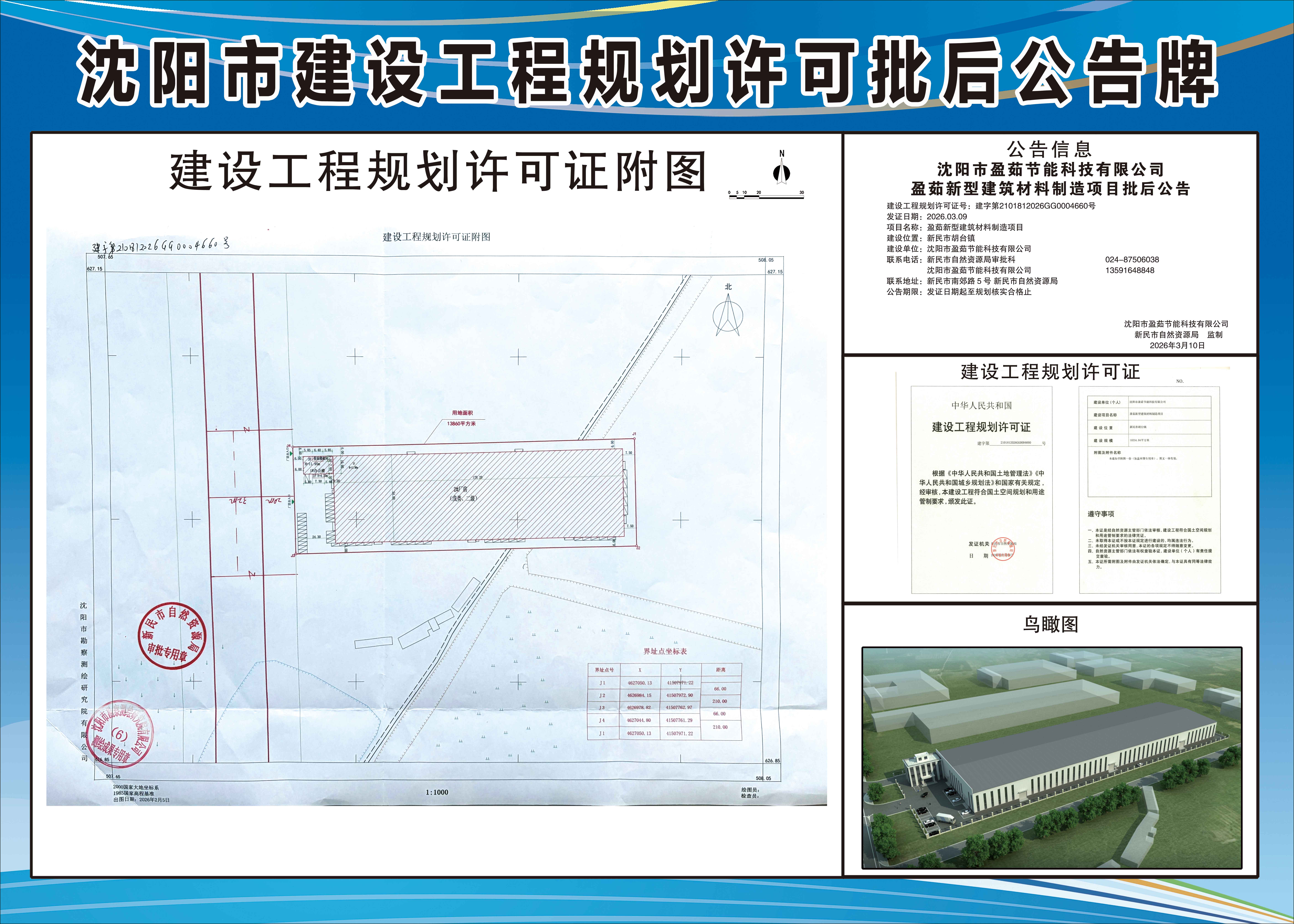 建设工程规划许可证号:建字第2101812026GG0004660号 发证日期:2026.3.9 项目名称:盈茹新型建筑材料制造项目 建设位置:新民市胡台镇 建设单位:沈阳市盈茹节能科技有限公司 联系电话:新民市自然资源局审批科,024-87506038 沈阳市盈茹节能科技有限公司,13591648848 联系地址:新民市南郊路5号,新民市自然资源局 公告期限:发证日期起至规划核实合格止 沈阳市盈茹节能科技有限公司 新民市自然资源局 监制 2026年3月10日