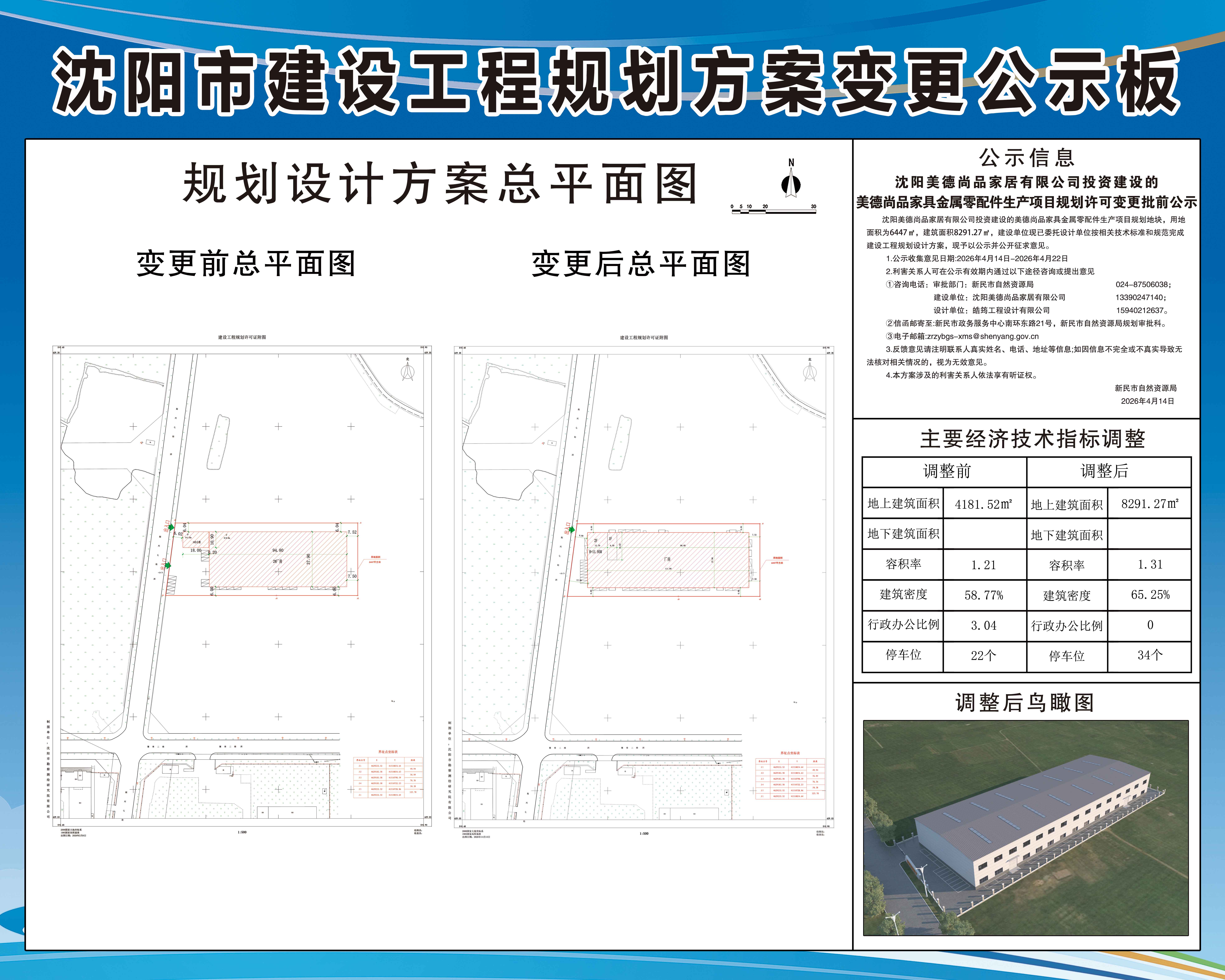沈阳美德尚品家居有限公司投资建设的美德尚品家具金属零配件生产项目规划地块,用地面积为6447㎡,建筑面积8291.27㎡,建设单位现已委托设计单位按相关技术标准和规范完成建设工程规划设计方案,现予以公示并公开征求意见。 1.公示收集意见日期:2026年4月14日-2026年4月22日 2.利害关系人可在公示有效期内通过以下途径咨询或提出意见 ①咨询电话: 审批部门:新民市自然资源局,024-87506038; 建设单位:沈阳美德尚品家居有限公司,13390247140; 设计单位:皓筠工程设计有限公司,15940212637。 ②信函邮寄至:新民市政务服务中心南环东路21号,新民市自然资源局规划审批科。 ③电子邮箱:zrzybgs-xms@shenyang.gov.cn 3.反馈意见请注明联系人真实姓名、电话、地址等信息;如因信息不完全或不真实导致无法核对相关情况的,视为无效意见。 4.本方案涉及的利害关系人依法享有听证权。 新民市自然资源局 2026年4月14日