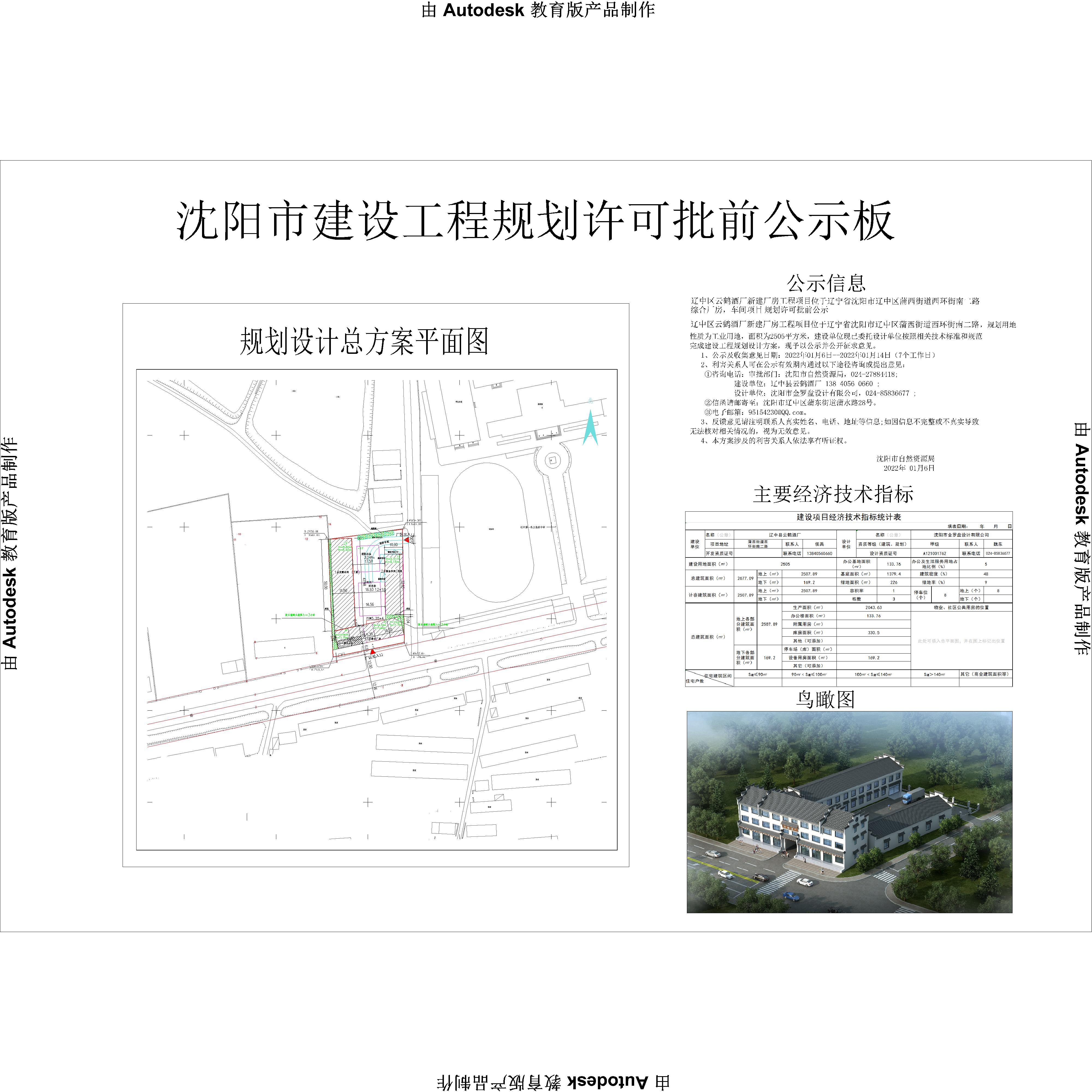 辽中区云鹤酒厂新建厂房工程项目位于辽宁省沈阳市辽中区蒲西街道西环街南二路综合厂房,车间项目规划许可批前公示 辽中区云鹤酒厂新建厂房工程项目位于辽宁省沈阳市辽中区蒲西街道西环街南二路,规划用地性质为工业用地,面积为2505平方米,建设单位现已委托设计单位按照相关技术标准和规范完成建设工程规划设计方案,现予以公示并公开征求意见。 1、公示及收集意见日期:2022年01月6日--2022年01月14日(7个工作日) 2、利害关系人可在公示有效期内通过以下途径咨询或提出意见: ①咨询电话:审批部门:沈阳市自然资源局,024-27884418; 建设单位:辽中县云鹤酒厂 138 4056 0660 ; 设计单位:沈阳市金罗盘设计有限公司,024-85836677 ; ②信函请邮寄至:沈阳市辽中区蒲东街道蒲水路28号。 ③电子邮箱:95154230@QQ.com。 3、反馈意见请注明联系人真实姓名、电话、地址等信息;如因信息不完整或不真实导致无法核对相关情况的,视为无效意见。 4、本方案涉及的利害关系人依法享有听证权。 沈阳市自然资源局 2022年 01月6日